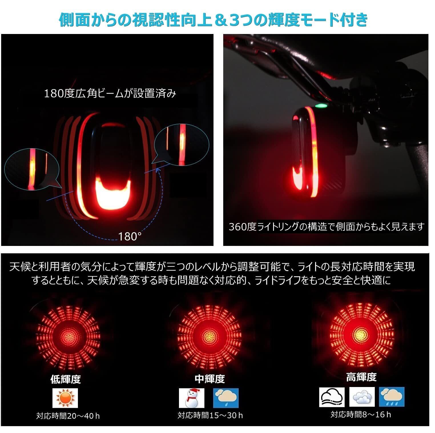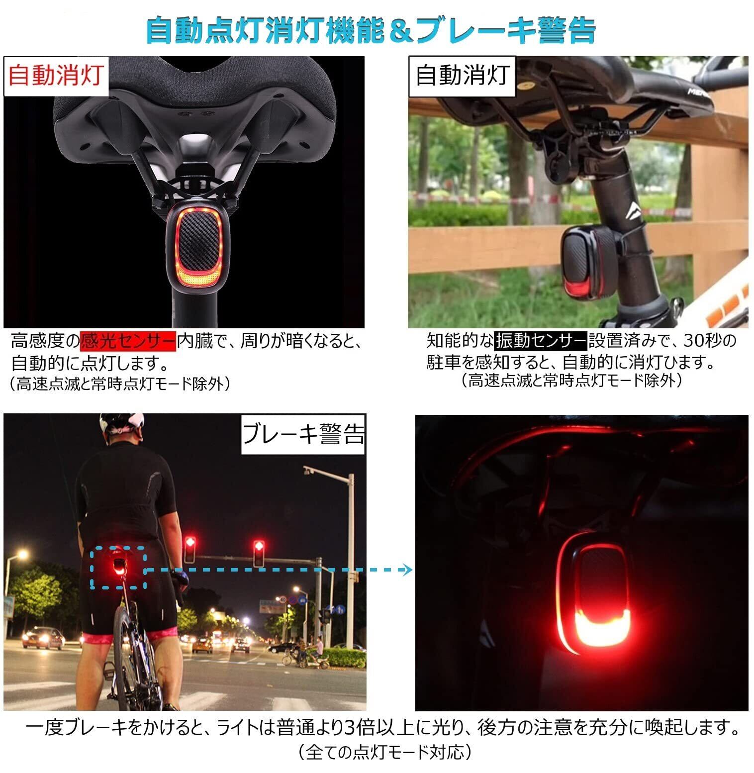 【振動センサー・感光センサー搭載&&3つの輝度モード&4つの点灯モード】❶(自動点灯)日中にトンネル等にさしかかる時や夕暮れ時にも自動的に点滅してくれるオート感光センサーが採用されます。❷(自動消灯)自転車の停止を振動センサーが検知すると約30秒後に消灯する機能も備えて、安全及び省エネのオートライトとなります。❸輝度は低、中、高が調整可能ですので、雨や霧で視界が非常に悪い時も対応する全天候型テールライトです。➍点灯モードは、普通点滅→呼吸点滅→高速点滅→常時点灯の順に切り替わります。