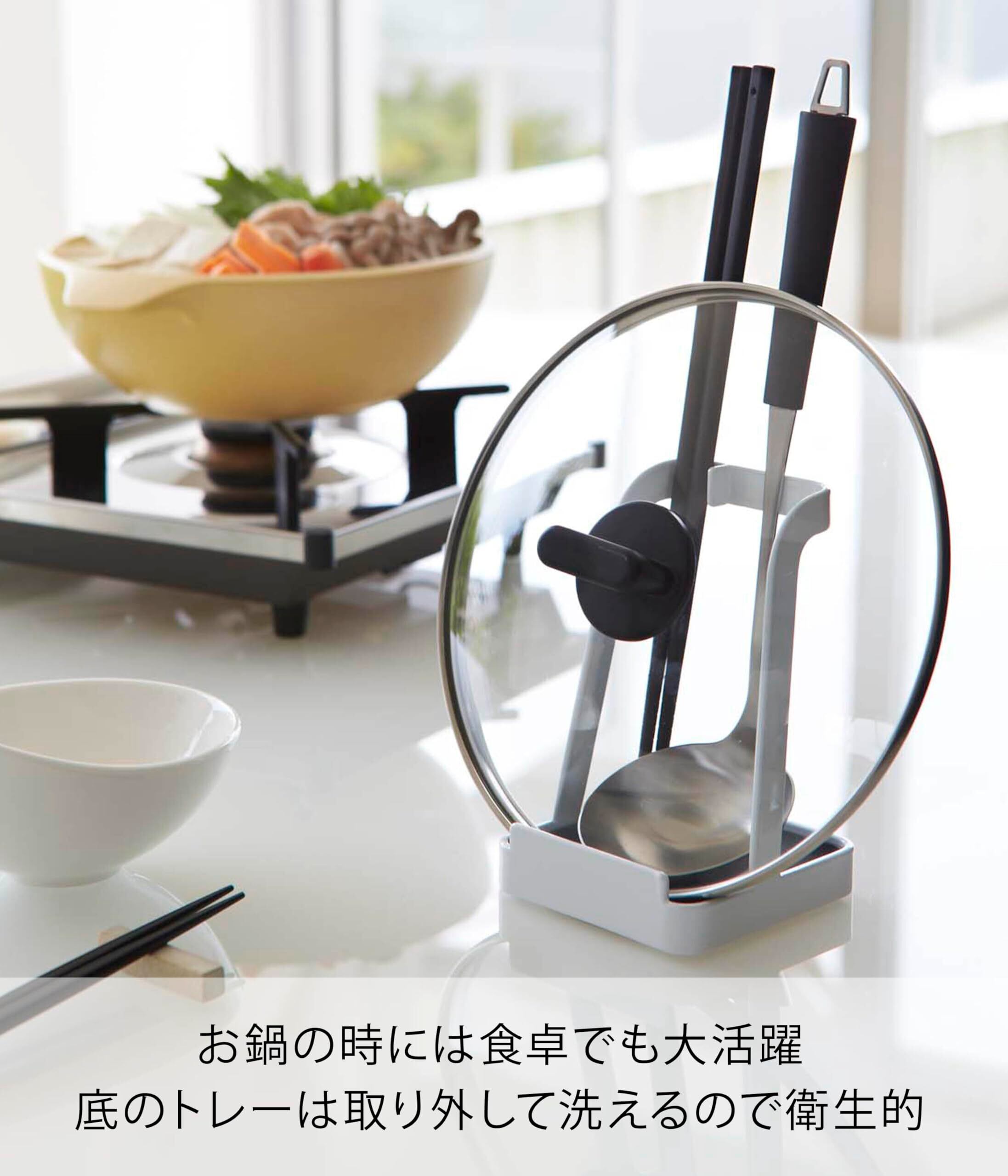 調理中にお玉や菜ばしや鍋ふたが置ける、ちょい置きスタンド。調理中のちょい置きに便利。お玉以外の小物(菜箸・ターナー・ヘラ・トング・しゃもじなど)や鍋蓋・フライパンカバーなどを立てることができます。トレイは取り外し可能でサッと洗えます。レシピスタンドとして。タブレットPCスタンドとしても。お鍋のときに食卓でも大活躍。