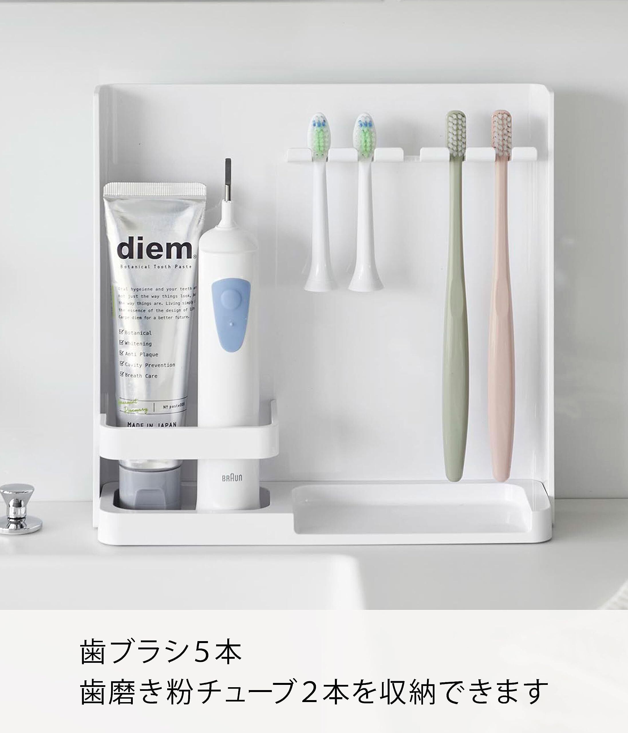 歯ブラシ5本、歯磨き粉チューブ2本を収納できます。