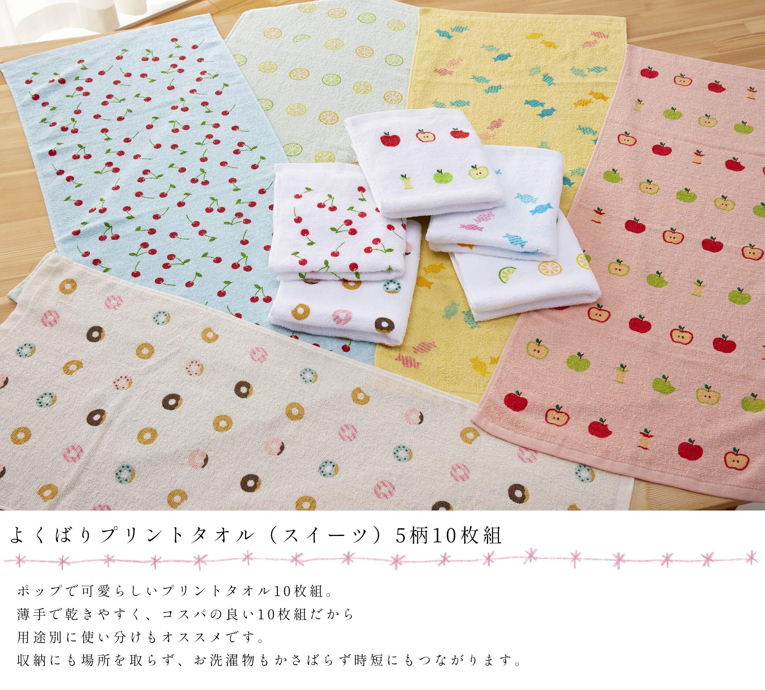 Kosugizen フェイスタオル よくばりプリントタオル スイーツ 5柄2色×1枚入 34×80㎝ 乾きやすい薄手タイプ まとめてお得 10枚セット SV-2008-10