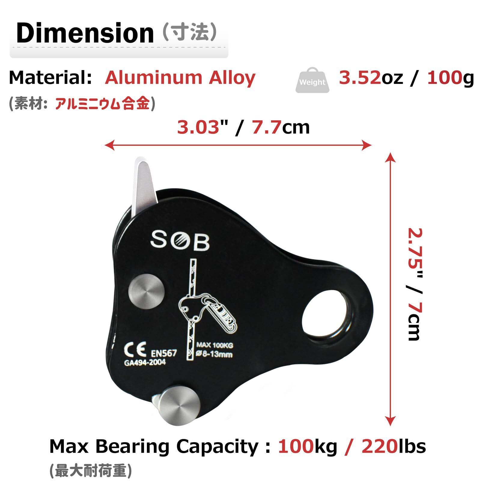 【強度】最大支持力は100kgです。直径8 - 13mmのロープに適しています。サイドプレートはスライドできるのでロープの位置を問わず取り外し可能
