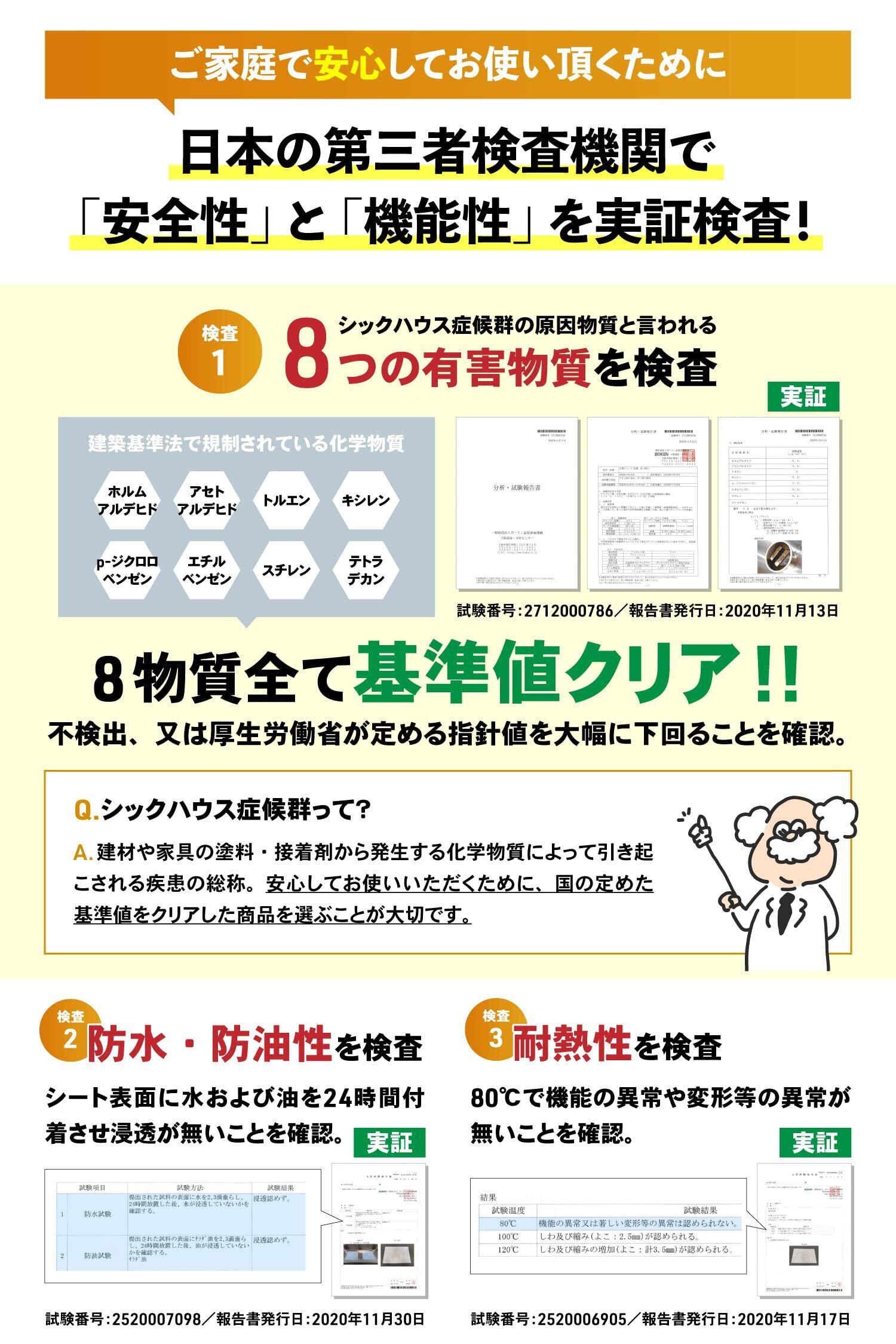 【品質・安全性について】日本の第三者検査機関で化学検査(ホルムアルデヒドなどの有害物質が含まれていないか)、防水、防油、耐熱性の「実証検査」を行っております。【保障について】国内で日本人スタッフが品質を最終確認・30日間の返金付き、まずはお気軽にお試しください。