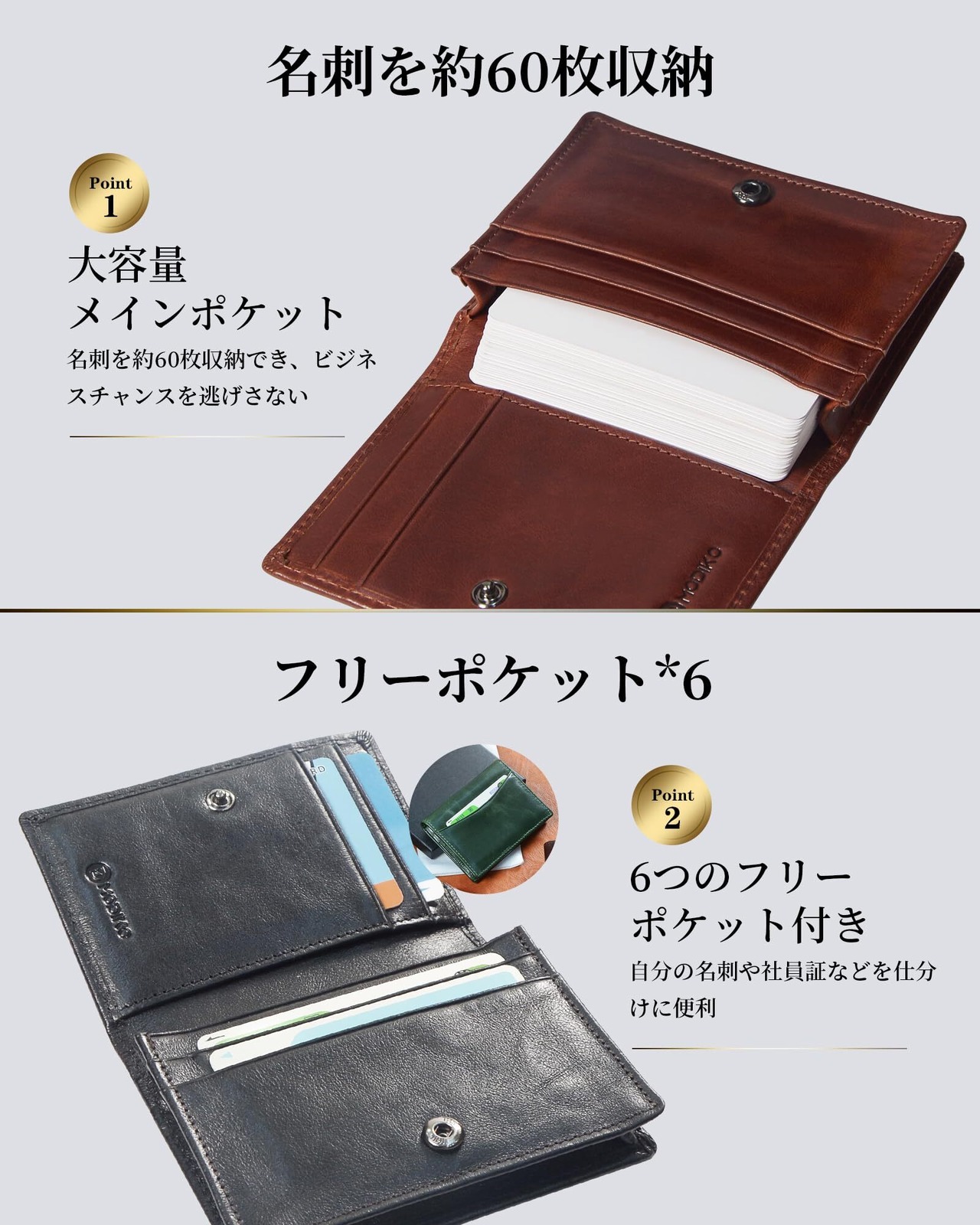 【60枚収納&6つフリーポケット】名刺を60枚収納でき、メインポケット以外にも6つのフリーポケット付きで、ご自身の名刺と頂いた名刺が混在する心配がありません。社員証などアイデア次第で単なる名刺入れを越えた様々な使い方ができます。