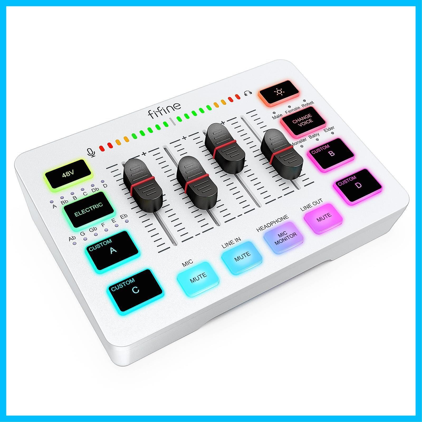 FIFINE ゲーミングオーディオミキサー オーディオインターフェース PC/PS4/PS5対応 ゲーム用オーディオミキサー ポッドキャスト ミキサー RGB機能付き ボイスチェンジャーボタン カスタム効果音 配信 実況 白 ミキサー FIFINE AmpliGame SC3W | Lulu