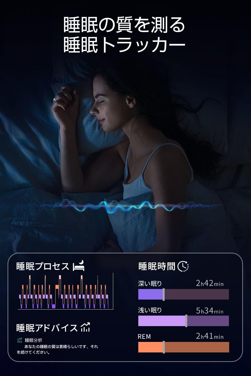 【睡眠管理と24h健康管理】 スマートリングの光学式センサー、重量センサー、赤色センサーによって、健康管理が可能です。夜間リングを付けたまま寝ると、翌日アプリより睡眠時浅睡眠、深睡眠、REM睡眠の時間帯、目覚めた回数などの睡眠の詳細が確認できます。睡眠の質評価とアドバイスも表示されます。また、他のデータも5分間ごとに精密で持続的に測定し、一日中のデータの詳細も確認でき、あなたのフィットネス目標の達成をしっかりします。