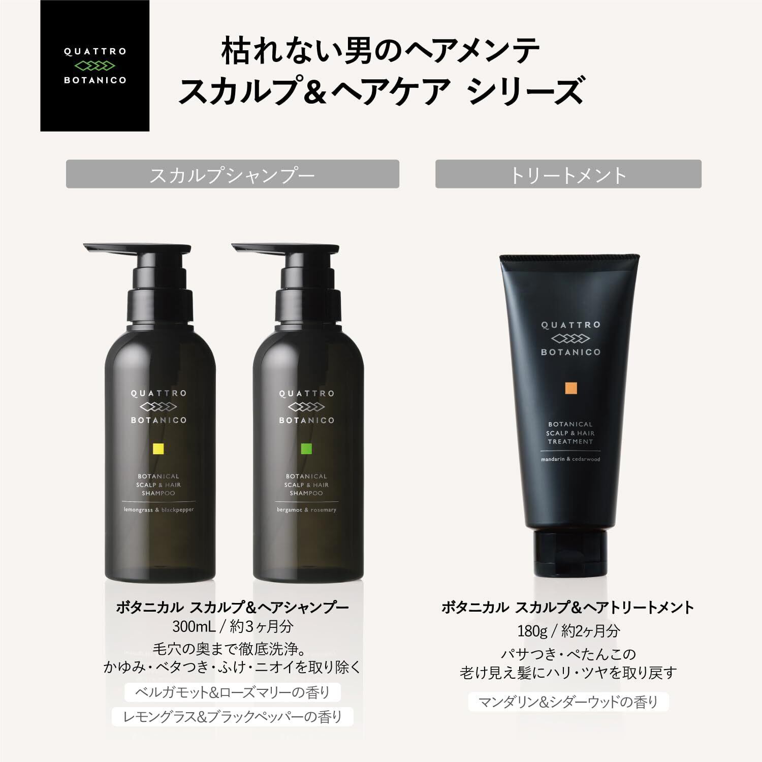 【シャンプーとセットで幅広い髪の悩みにアプローチ】本製品は、クワトロボタニコのシャンプー「ボタニカルスカルプ&ヘアシャンプー」とセットでのご使用をおすすめします。シャンプーが頭髪のトラブルの元となる頭皮の毛穴の汚れを奥まで徹底的に取り除き、さらにトリートメントによって、ハリ・ツヤを与え、髪と頭皮のエイジングケア*をすることが可能に。2品でミドルエイジ男性が抱える幅広い髪と頭髪の悩みに積極的にアプローチします。