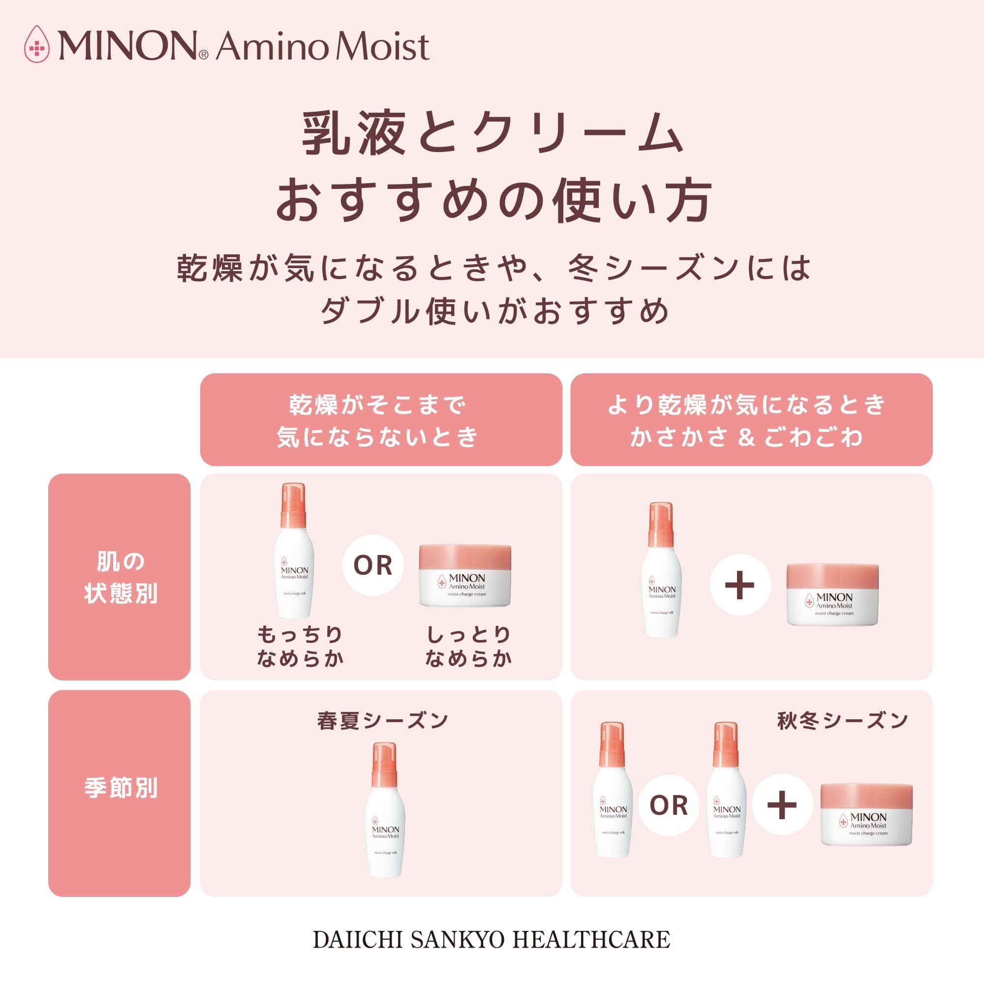 【ミノンから生まれたフェイスケア「ミノン アミノモイスト」】敏感肌を研究し続けた製薬会社がつくる独自の処方で「やさしさ」×「美しさ」を実現しました。バリア機能が低下しがちな肌を守りながら洗い、うるおいで満たして、すこやかに美しく保ちます。