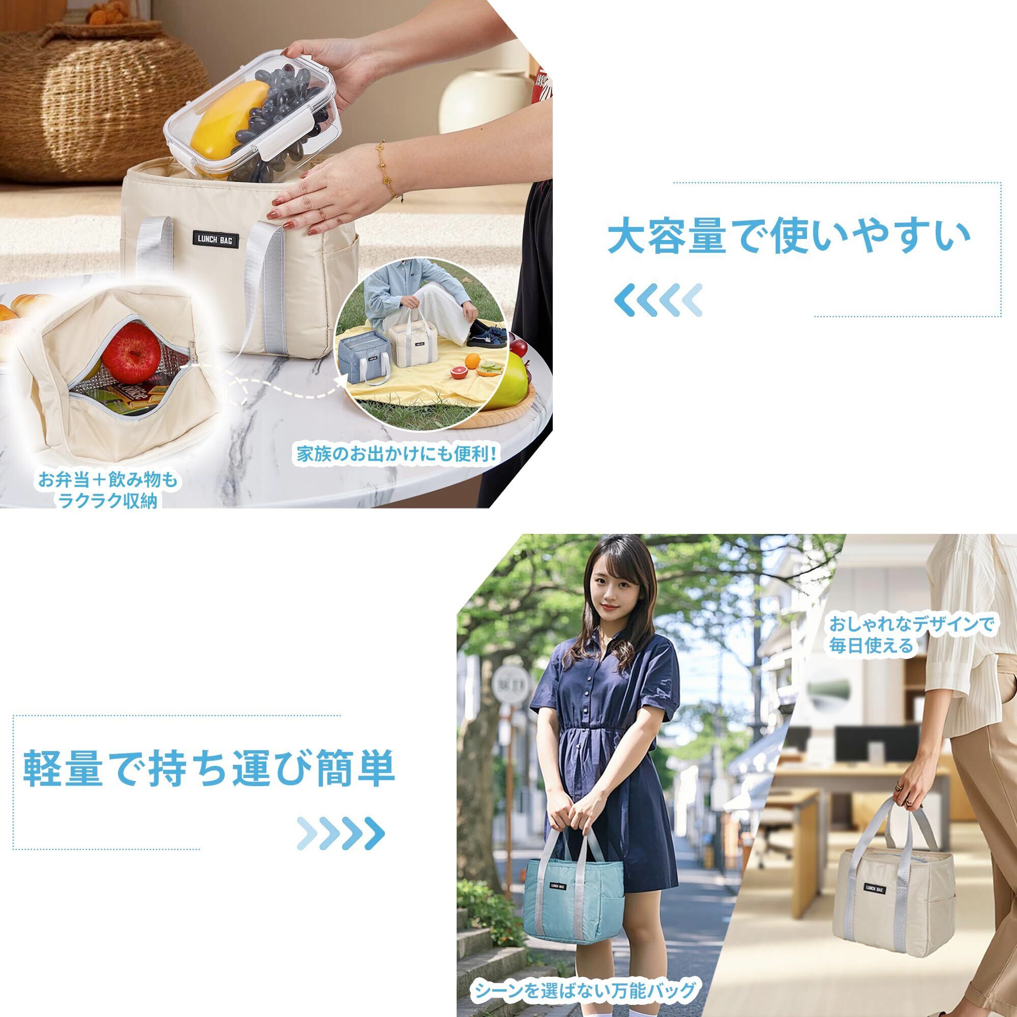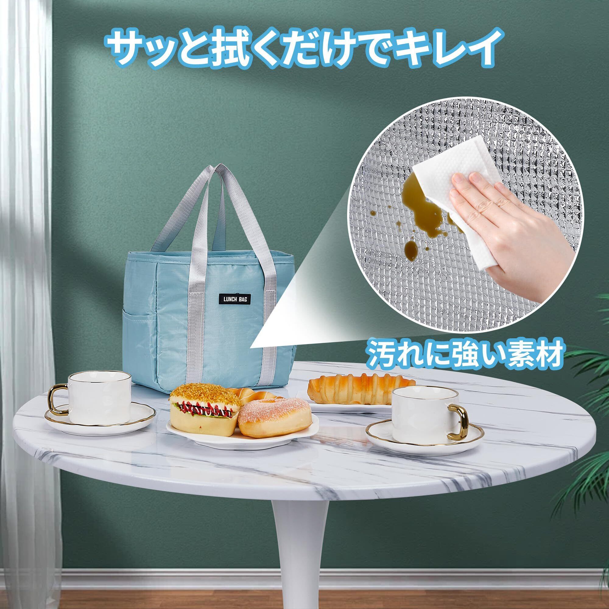 【保温・保冷機能がある】:ランチバッグの内側には高効率の保温・保冷素材を使用し、食べ物の温度を長時間キープ。熱い食事や冷たい飲み物も最適な温度で持ち運びでき、通勤・通学はもちろん、ピクニックや旅行にも便利です。