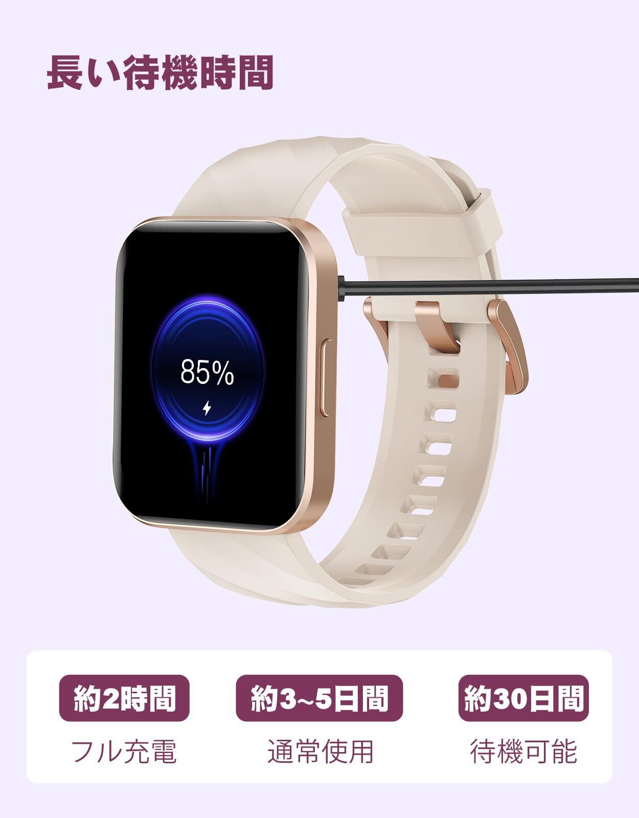 【大容量バッテリー&便利な機能満載】長い持ちのバッテリー搭載され、一回フル充電、3~5日間の連続使用も問題なく、待機時間は約30日間です。頻繁に充電する手間が省けます。付属の磁気充電ケーブルをスマートウォッチの充電端子に接続すると充電開始となります(実際の使用状況や環境によって電量持ち時間が異なります)通知やBluebooth通話などの基本的なスマートウォッチ機能に加え、例えば、音声アシスタント、おやすみモード、携帯検索、天気予報、懐中電灯、電卓、ゲーム、目覚まし時計、ストップウォッチ、SOSなど、日常生活をより快適にする機能が搭載されています。また遠隔操作もお任せください。ios9.0以上、android5.0以上のスマホに対応可能、さまざまシーンで使用できます!レディースでも、メンズでも、幅広い方にお使いいただけます。敬老の日、誕生日、父の日、母の日、新年、 クリスマスなどに適用なプレゼントとなります。