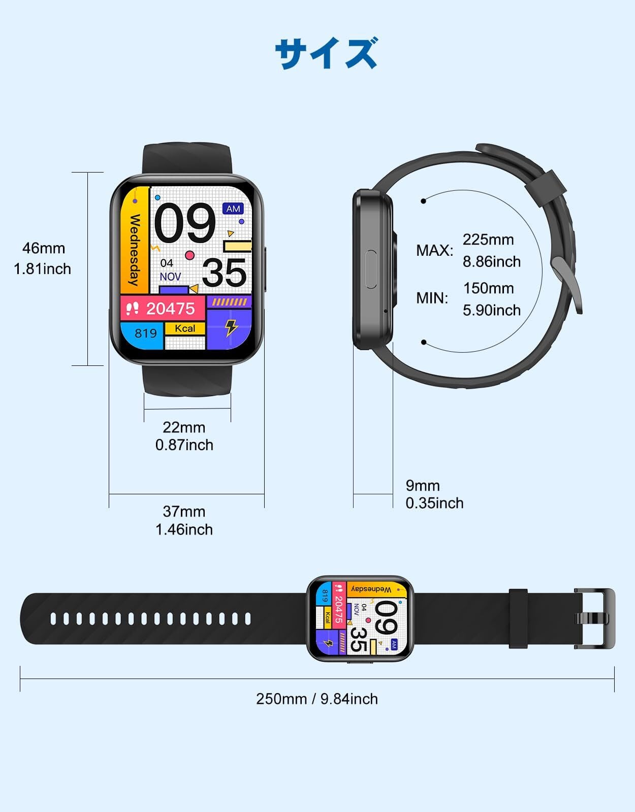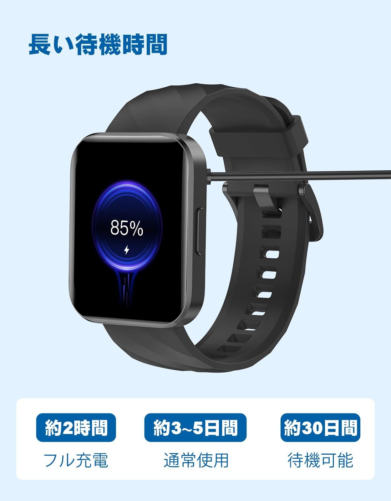 【大容量バッテリー&便利な機能満載】長い持ちのバッテリー搭載され、一回フル充電、3~5日間の連続使用も問題なく、待機時間は約30日間です。頻繁に充電する手間が省けます。付属の磁気充電ケーブルをスマートウォッチの充電端子に接続すると充電開始となります(実際の使用状況や環境によって電量持ち時間が異なります)通知やBluebooth通話などの基本的なスマートウォッチ機能に加え、例えば、音声アシスタント、おやすみモード、携帯検索、天気予報、懐中電灯、電卓、ゲーム、目覚まし時計、ストップウォッチ、SOSなど、日常生活をより快適にする機能が搭載されています。また遠隔操作もお任せください。ios9.0以上、android5.0以上のスマホに対応可能、さまざまシーンで使用できます!レディースでも、メンズでも、幅広い方にお使いいただけます。敬老の日、誕生日、父の日、母の日、新年、 クリスマスなどに適用なプレゼントとなります。
