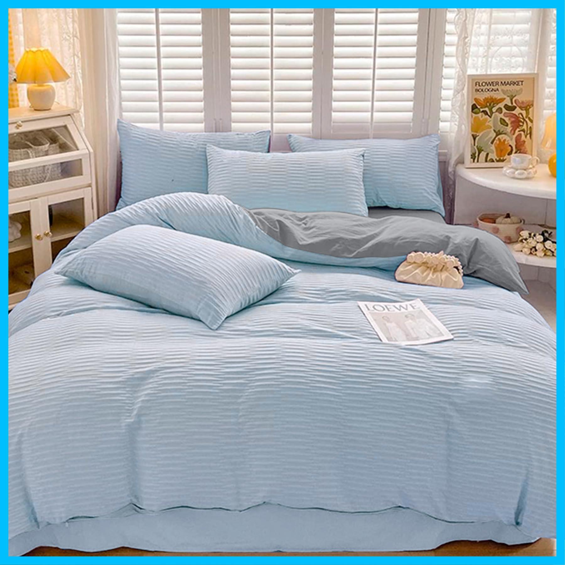 布団カバー AYO シングル 3点セット寝具カバーセット 洋式ベッド・和式布団兼用 掛け布団カバー ボックスシーツ 枕カバー ベッド用 シアサッカー生地 布団用 優しい肌触り柔らかい 洗い替え 速乾タイプ ピーチスキン加工 四季通用(ブルー+グレー,シングル) | Lulu