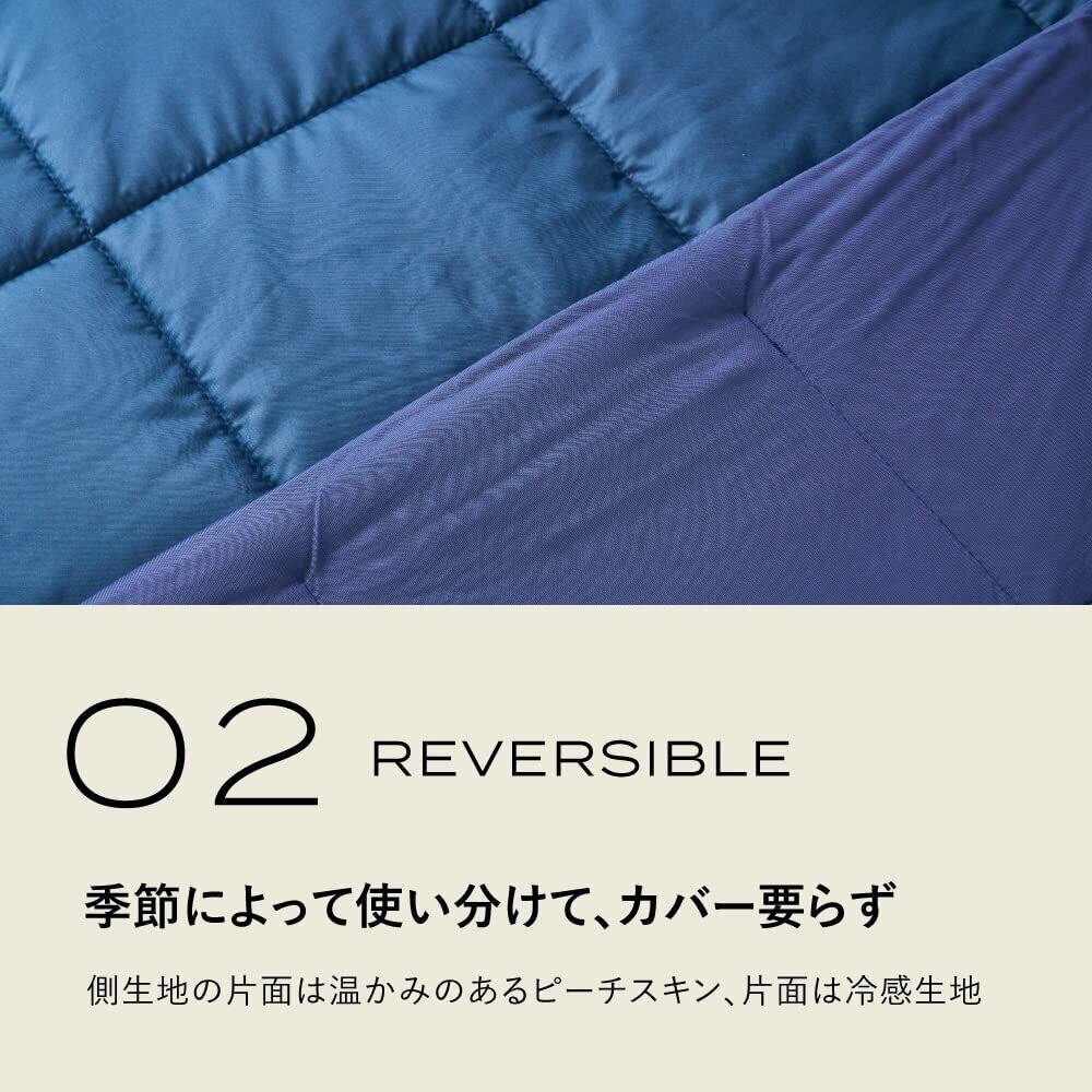 季節に合わせて生地の表裏を使い分け。暖かい季節はさらっとした接触冷感生地を肌側に、寒い季節は柔らかくてなめらかなピーチスキン生地でやさしく包み込みます。カバーをかけずにご使用ください。