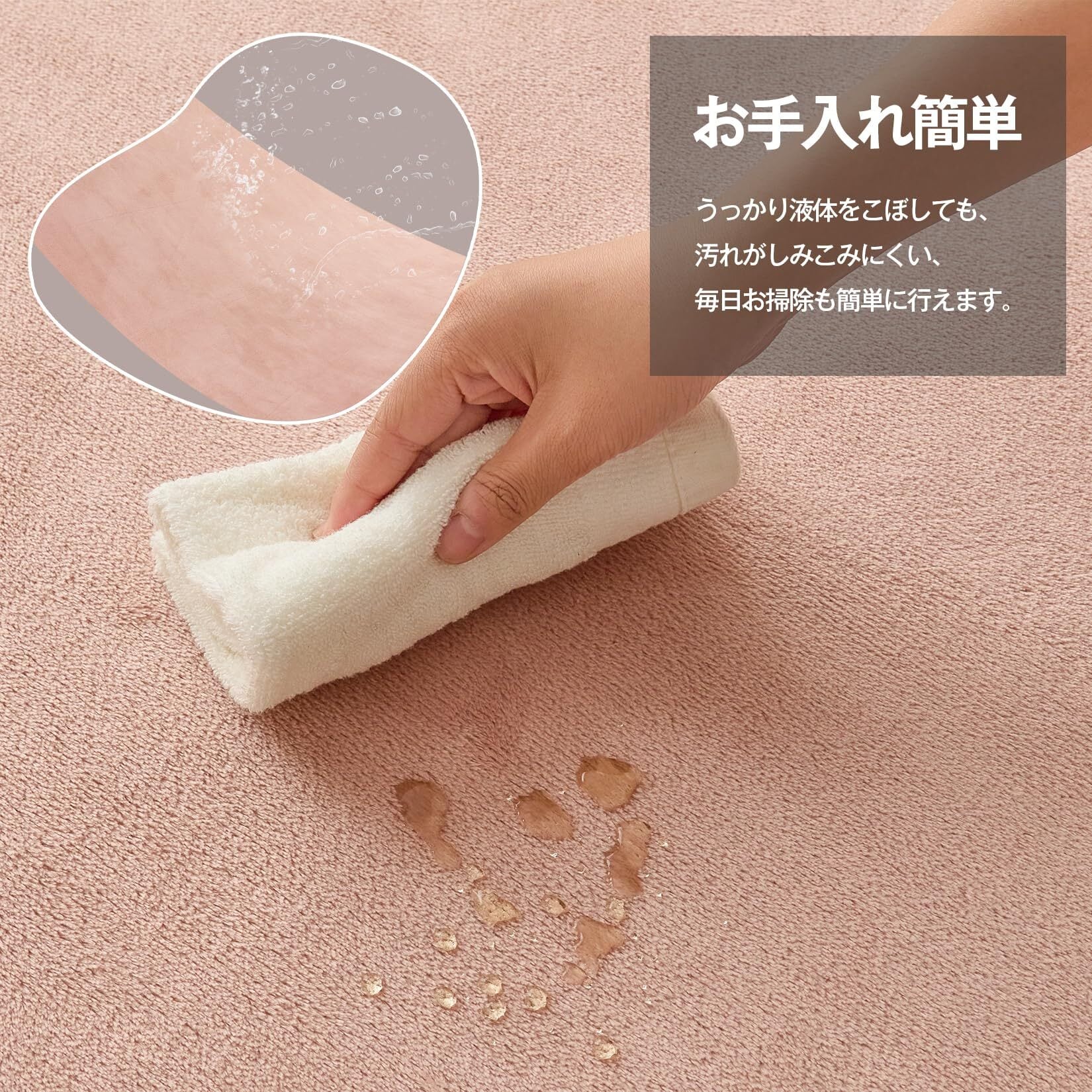 【お子さまやペットのいるご家庭に嬉しい<はっ水加工>・滑り止め付きのラグ】液体をこぼしても、カーペット表面で水玉状になるのでサッと拭くだけ!汚れが付きにくく、お手入れ簡単です。(防水ではありませんので放置すると染み込む恐れがあります。早めにお拭き取りください。)滑り止めも付いていて、床面をしっかりキャッチしてより滑りにくくなりました。掃除機をかける時も滑らないのでストレスから解放されます。