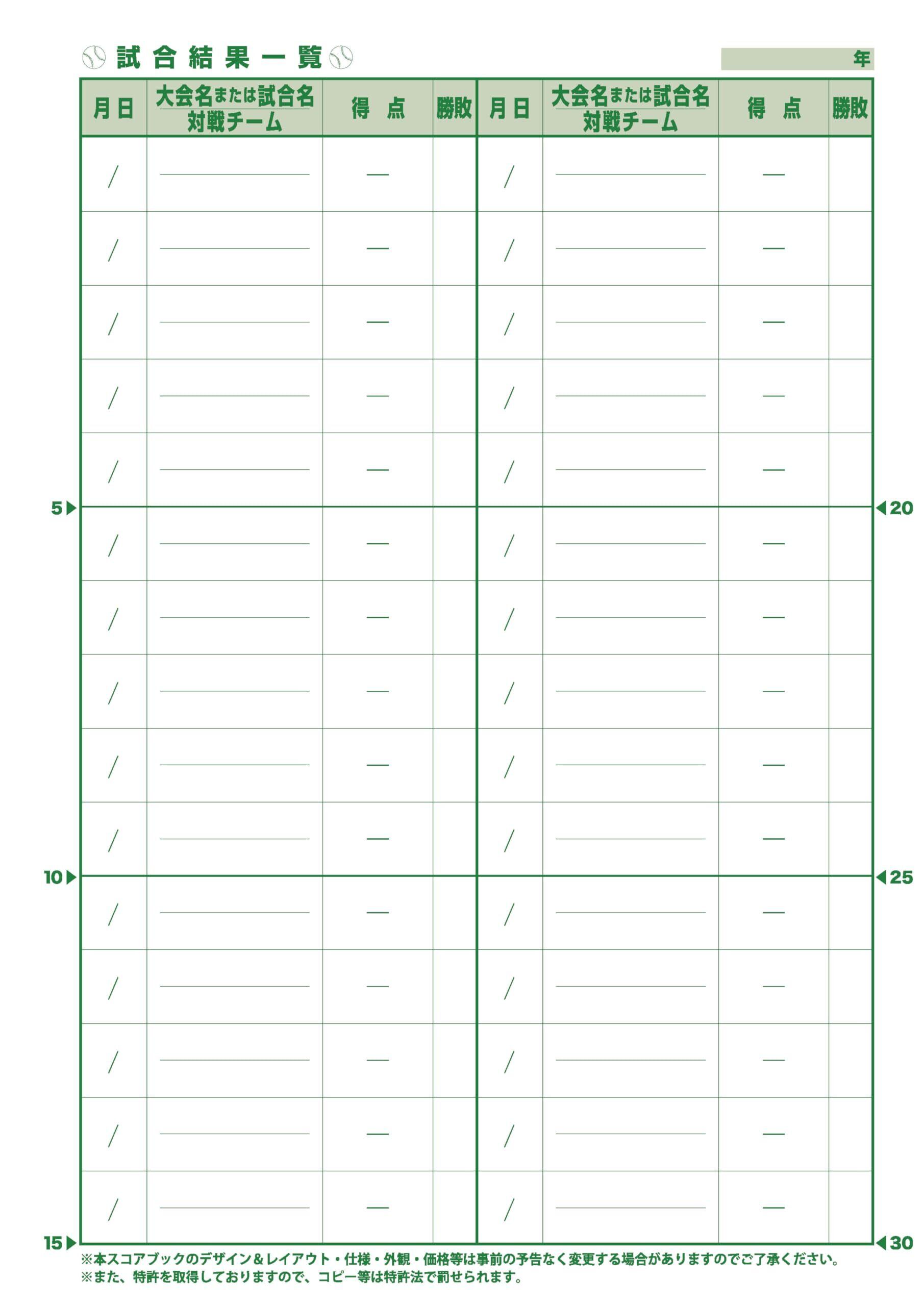 40試合分の結果一覧表と簡単なスコアブックの付け方の解説がついています