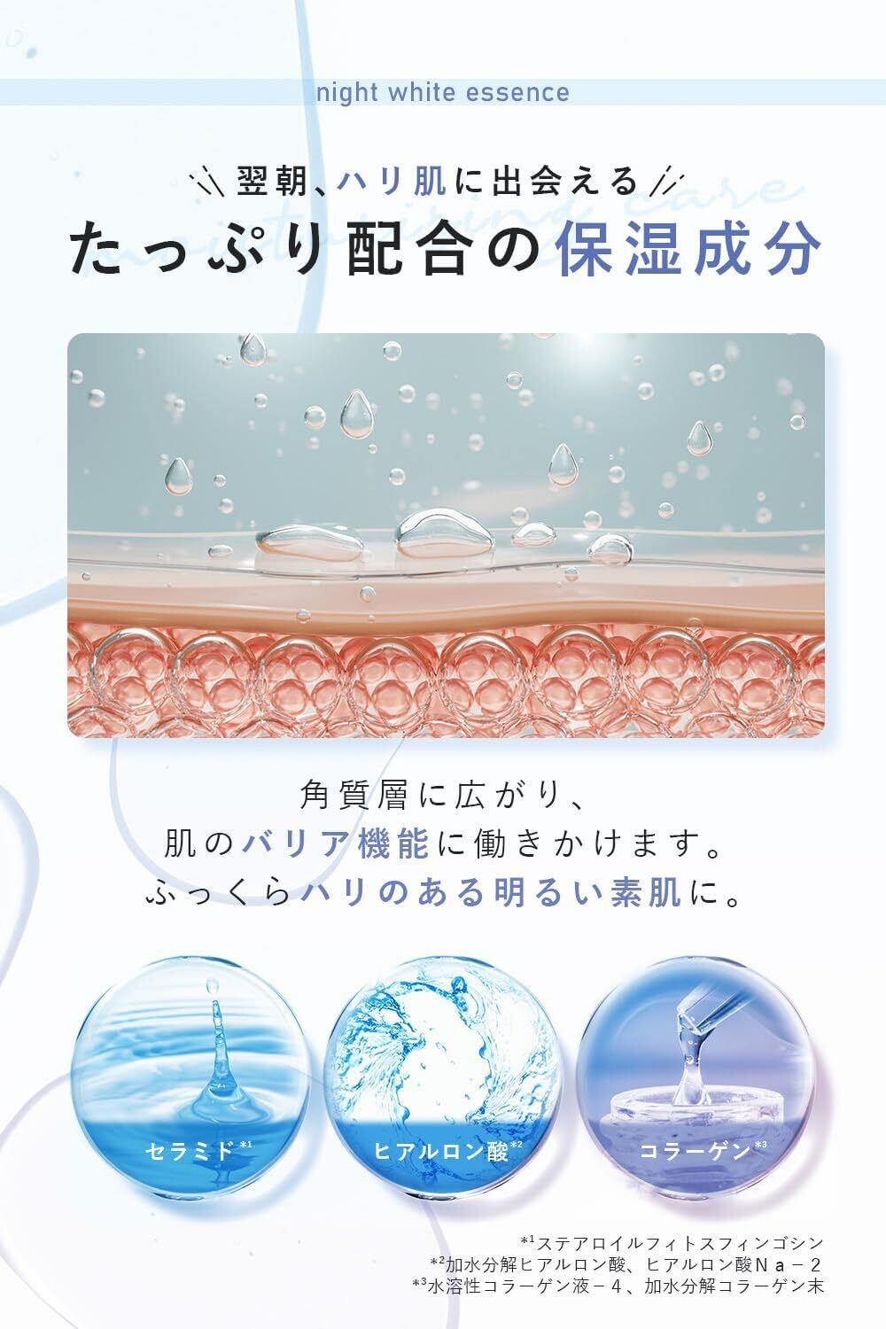 【 濃密なうるおい 】うるおいを深く感じて、目覚めの朝までみずみずしさを保てる「セラミド・ヒアルロン酸・コラーゲン」を贅沢配合。エイジング肌のバランスも整え澄んだ透明感を。