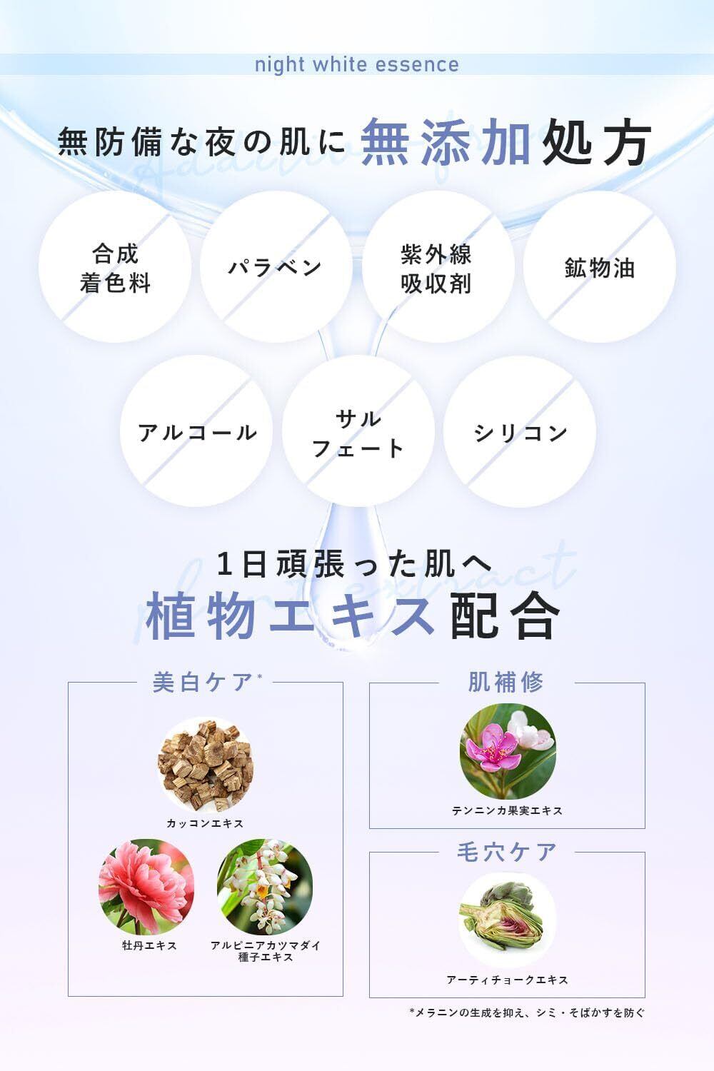 【 目覚めた朝、キメを感じる 】肌が生まれ変わる睡眠中の肌に向けて仕込むナイトスキンケア。「Beautiful in Whiteの香り」に包まれながら眠りに入り、翌朝の肌質を高める。