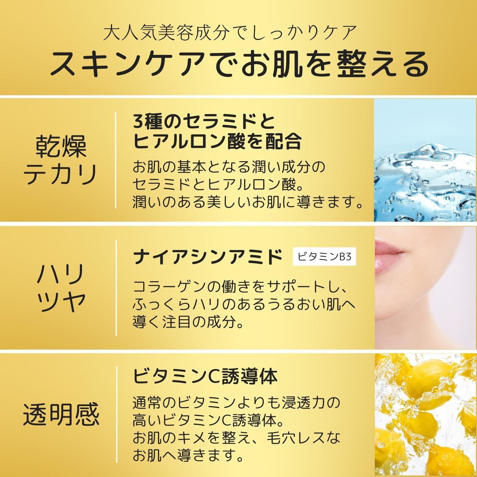 【ビタミンC誘導体配合】ビタミンC誘導体の力で、毛穴ケアと透明感アップを同時に実現。肌の奥深くまでうるおいを届けながら、紫外線によるダメージをケアし、均一でなめらかな肌へ。