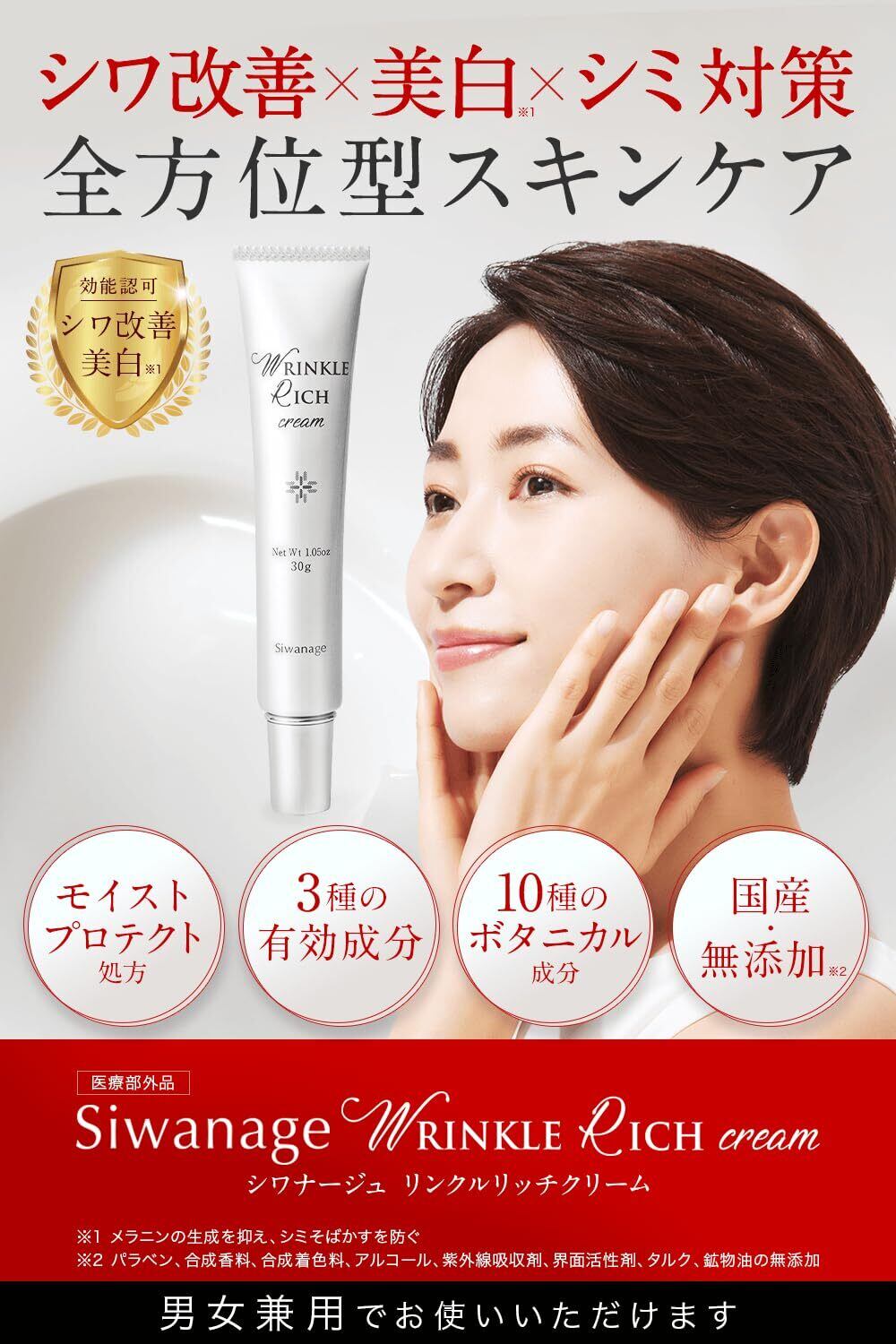 【効能認可】日本で唯一のシワ改善しながら美白・シミ対策もできる、ほうれい線対策リンクルリッチクリーム「薬用Siwanage(シワナージュ)」(目元や口元、首元と気になる部分のシワを改善します)