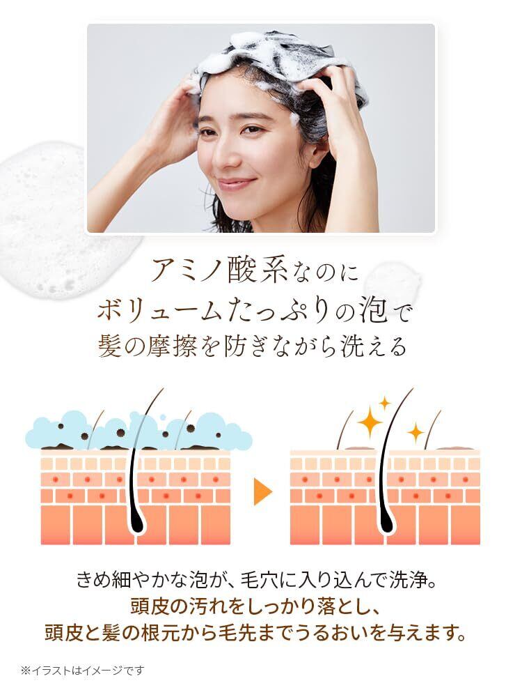 アミノ酸系洗浄料ベースの濃密な泡が、頭皮の乾燥を防ぎながら髪を摩擦なく優しく洗い上げる。