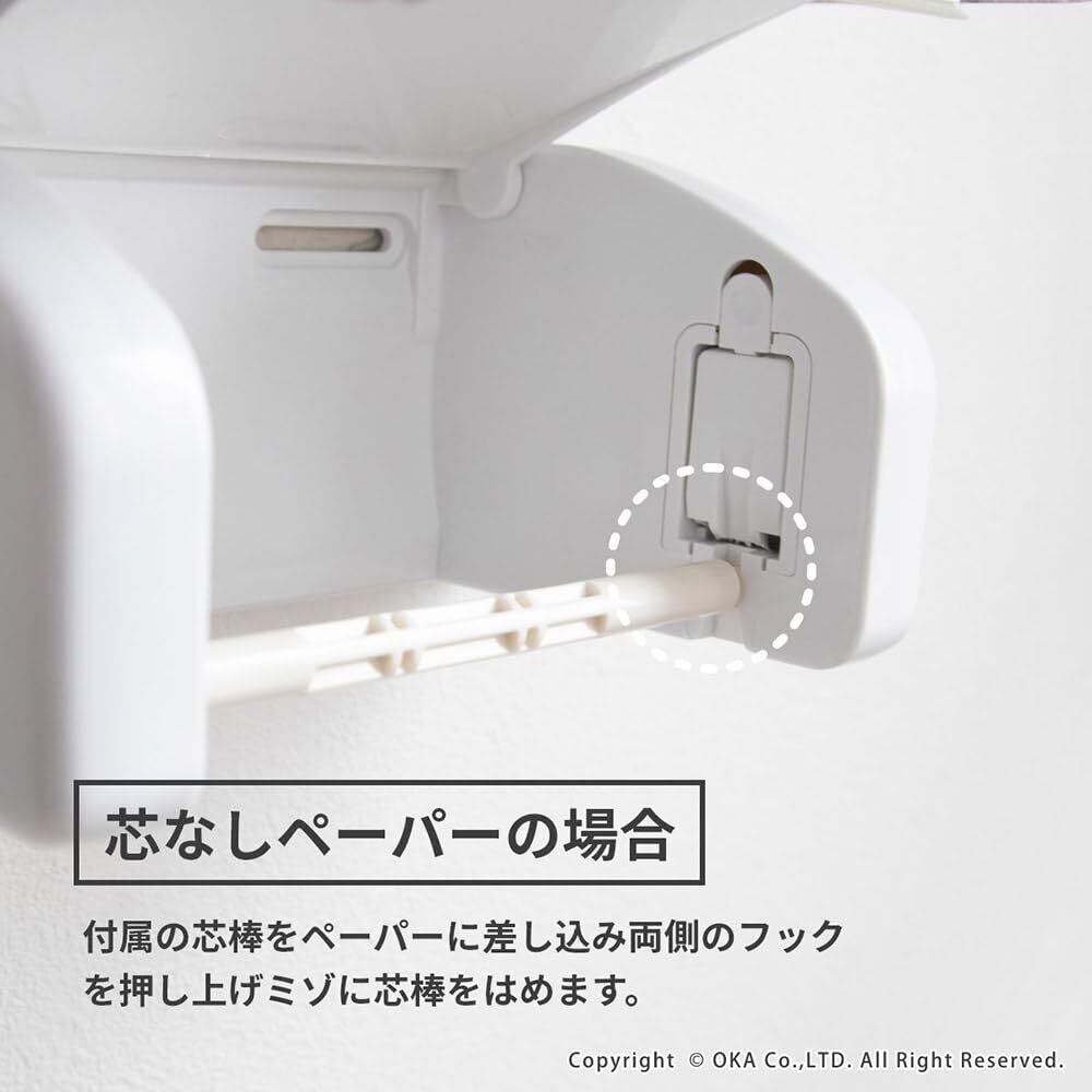 長年人気のワンタッチペーパーホルダーから進化した棚付きができました。大きめの棚には置く場所に困っていた、携帯電話や本、消臭雑貨など置くことができます。フタが紙をしっかり押さえる構造で片手でも軽くペーパーがカットできます。芯ありペーパーはもちろん付属の部品で芯なしペーパーにも対応できる優れもの!