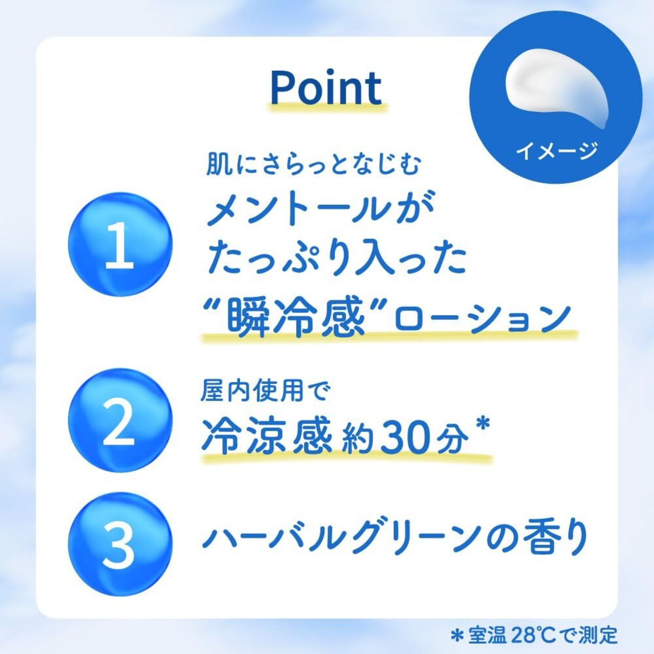 いつでもどこでもサッとひと塗り 涼しさ まとう ●肌にさらっとなじむメントールがたっぷり入った“瞬冷感”ローション ●屋内使用で冷涼感が約30分※持続 ※室温28℃で測定 ●ハーバルグリーンの香り