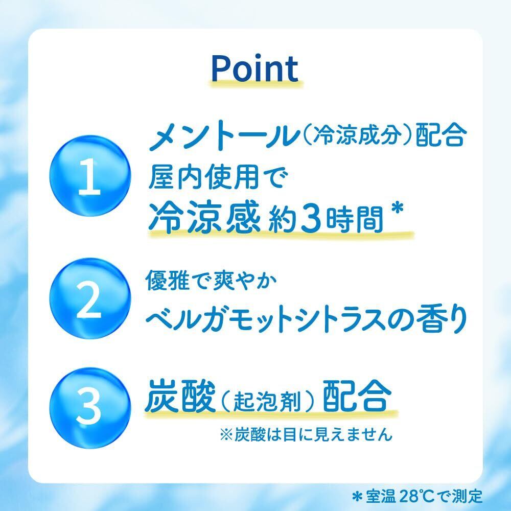 ムシムシ暑い日も冷涼感つづく!気分スッキリ軽やか 炭酸(起泡剤)配合 メントール(冷涼成分)配合 屋内使用で心地よい冷涼感が 約3時間※ ※室温28°Cで測定 優雅で爽やかベルガモットシトラスの香り ●開封するだけでひんやり ●使いきりタイプ