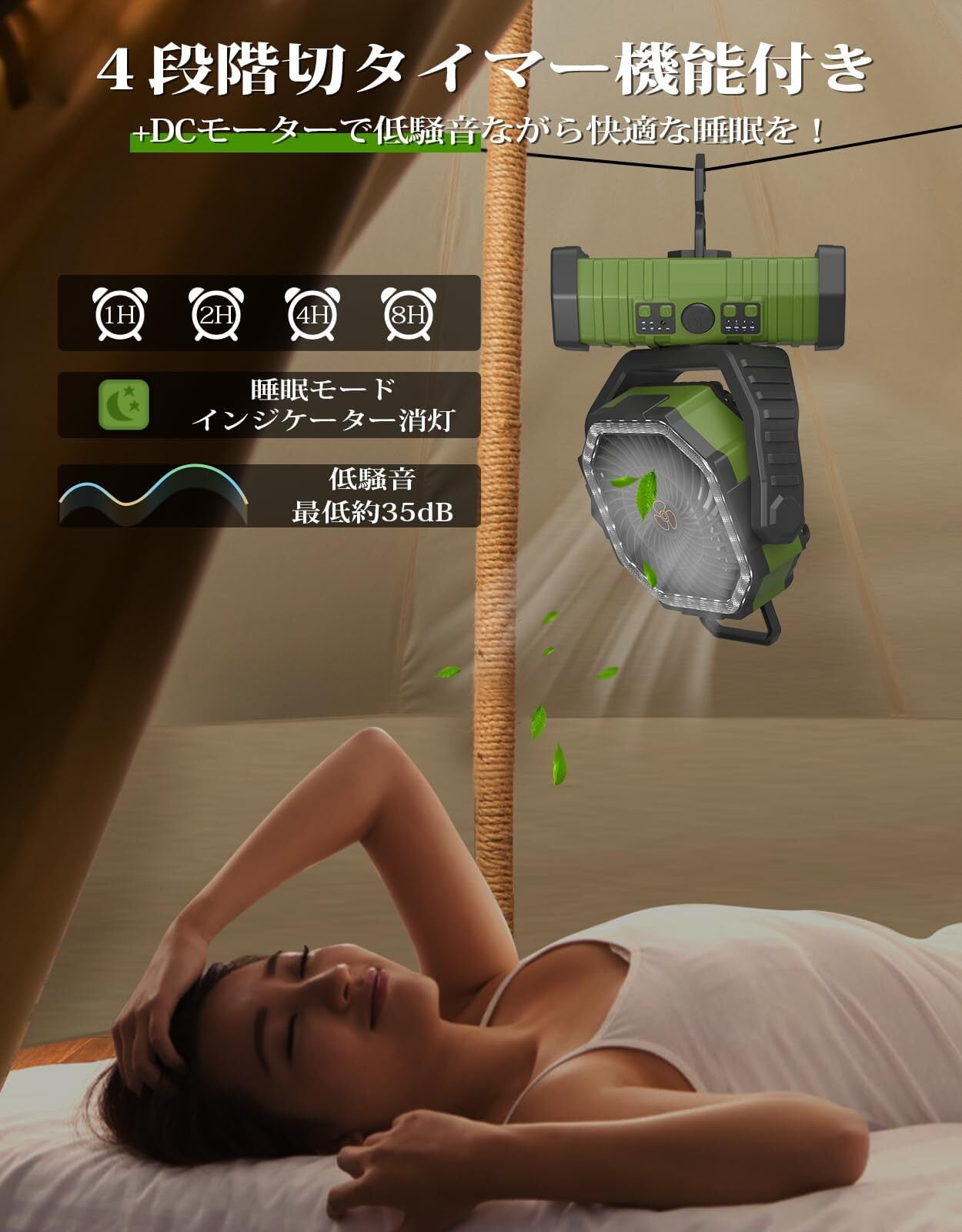 【頑丈な材質&PSE認証済み&1年安心保証】 キャンプ 扇風機は頑丈で耐久性のある構造を採用し、落下や衝突を防ぐことができ、頑丈な台座は強力な安定性を提供し、庭、キャンプ、遠足、ピクニック、釣り、車中泊、ボートなどのアウトドア扇風機に最適です。カラーはアウトドアスタイルにマッチしたグリーンで、汚れにくいも特徴です。PSE国際規格認証を取得しており、安心してお使いいただけます。※扇風機は同時に12ヶ月保障があります、初期不良からご使用中まで、ご不明な点がございましたら、「アカウントサービス」→「注文履歴」→「販売元」→「質問する」より弊店までご連絡いただければ迅速に対応いたします。