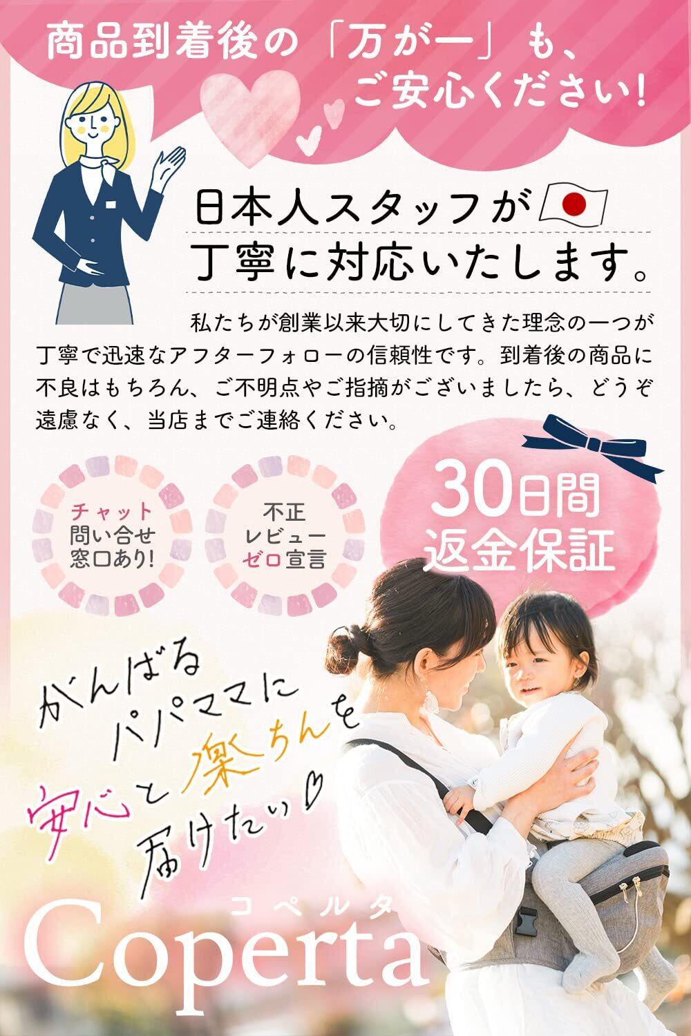 【腰の負担軽減】 コぺルタのヒップシートは、従来に製品をクッション材の厚みをUPさせることで、赤ちゃんの骨盤の安定性保持だけでなく、子育てを頑張るママさんやパパさんの体への負担軽減にも繋がります。 またヒップシートは肩、腰、お腹の3点でだっこできる為、抱きおろしや片手に鞄を持ちながらでも十二分にご使用いただけます。