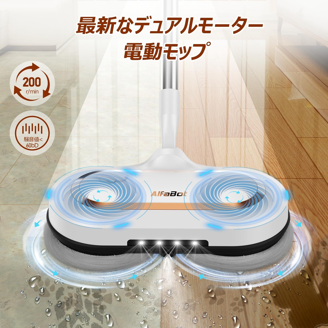 【ダブル回転ヘッド&回転速度が大幅にアップ】AlfaBot S2 電動モップは、1分間に200回転でき、モップ ヘッドを自動的に前方に押すデュアル モーターを備えているため、家やキッチンの床から頑固な汚れ、泥、汚れをより速く取り除くことができます。 お年寄りやお子様でも簡単にご使用いただけます。