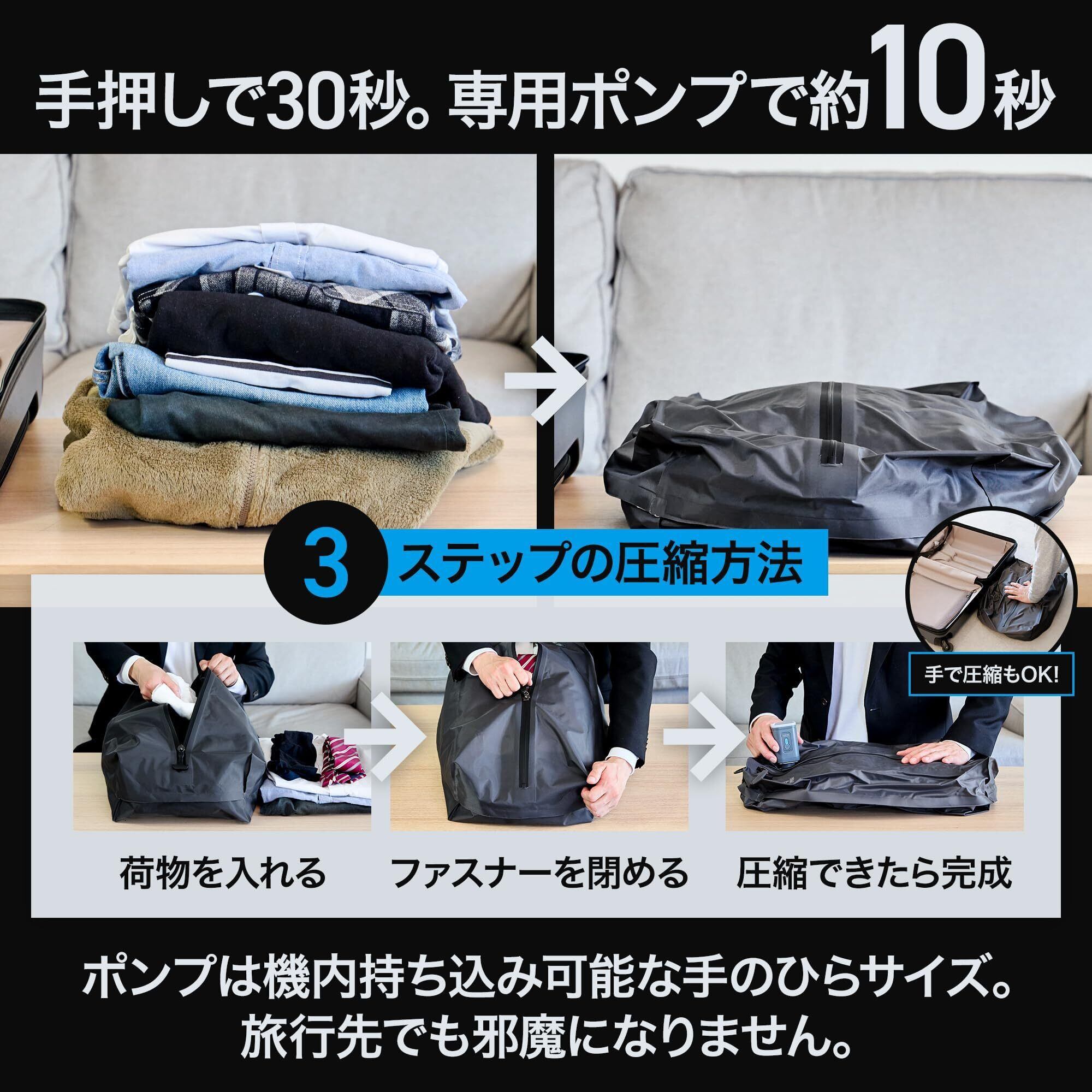 【電動ポンプなら約10秒で圧縮】圧縮トラベルバッグは専用の電動ポンプを使うと、約10秒で高速圧縮できます。電動ポンプをノズルにはめて、スイッチを押すだけ。手押しなら、約30秒ほどで圧縮できます。