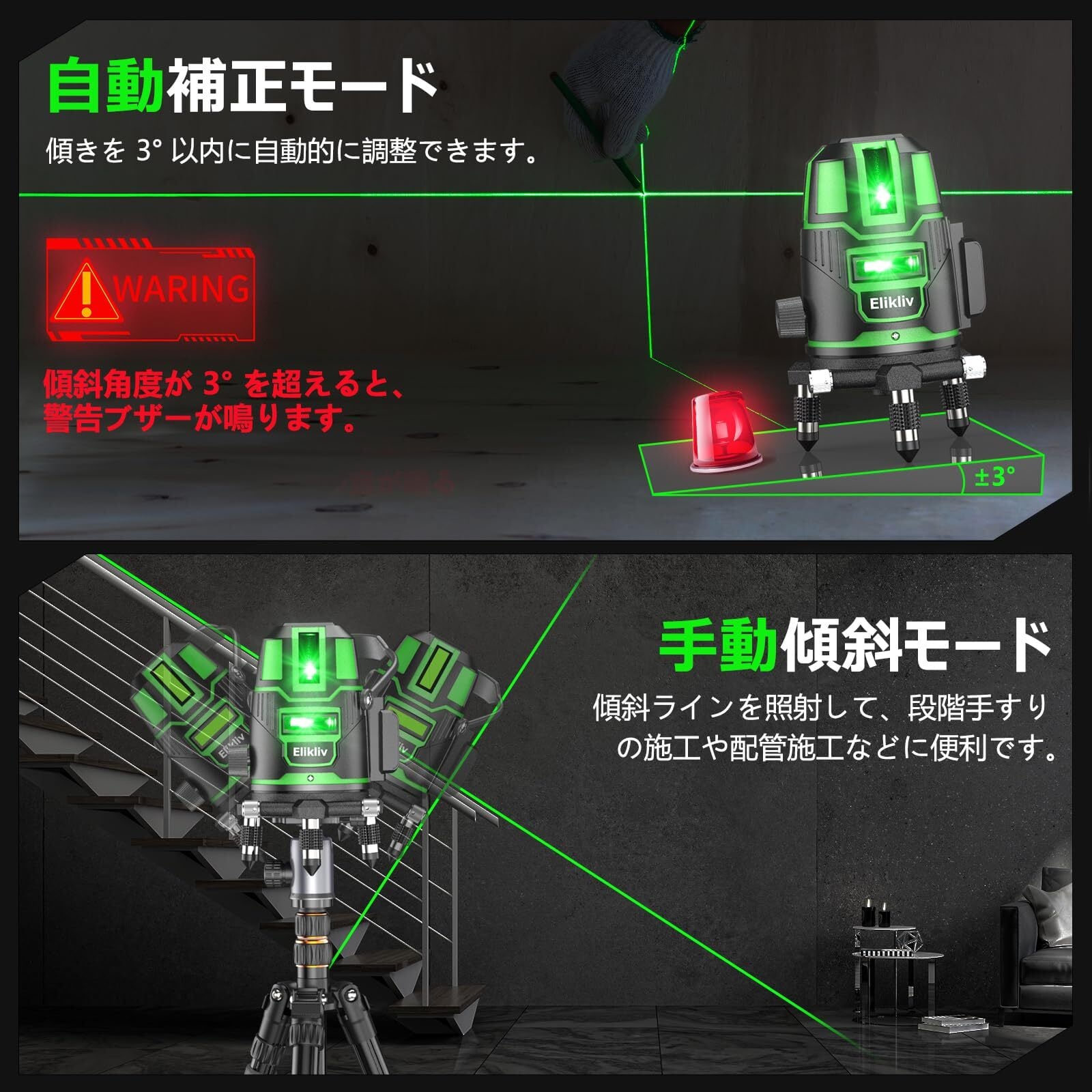 Elikliv レーザー墨出し器 レーザー 水平器 レーザー レベル グリーン 5ライン 4方向大矩照射 360°微調整 大容量バッテリー2個 高輝度 高出力 自動補正 軽天作業 測量建築 DIY 軽量 小型 屋内屋外 アルミケース付き 型番:B5