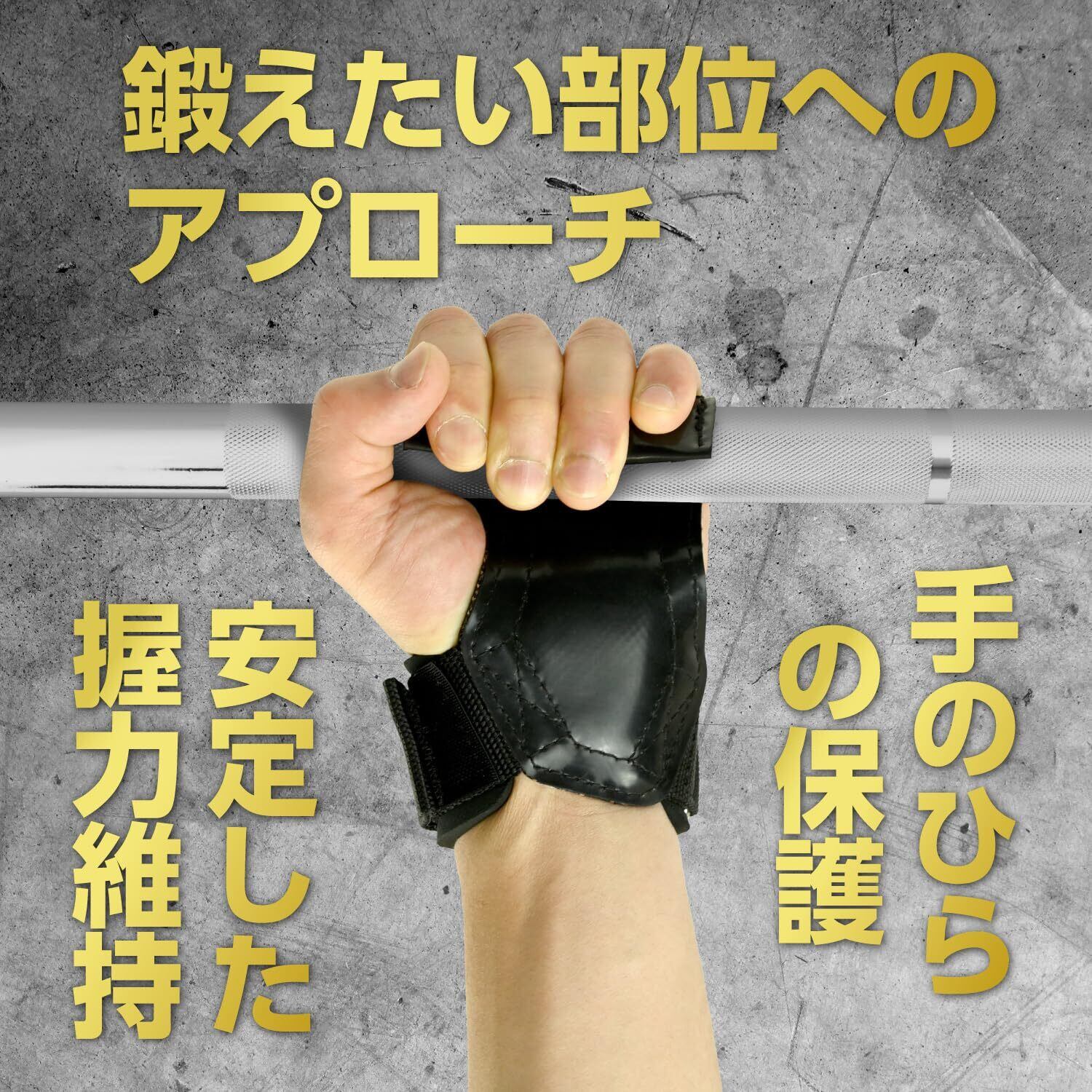 【ターゲット部位を限界まで追い込める】トレーニング中の握力をし、セット後半でも限界まで追い込めます。握力の消耗を気にせず、目的の筋肉に集中できるため、デッドリフトや懸垂などの種目でのレップ数や使用重量の向上に繋がり、トレーニング全体の質を高める効果が期待できます。