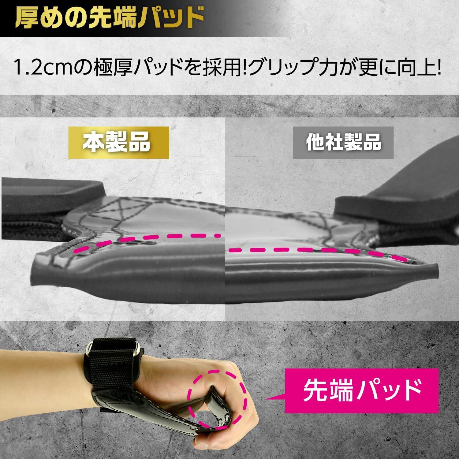 【厚めの先端パッド】先端のパッドの厚めの約120mmを採用。先端パッドを厚めにすることによってバーの接地面で固定されやすくなり、ホールド力の向上を実現しました。ベロ先端はバーベルの抜け落ち防止のため、クッションが入りグリップ力を更に強化させます!