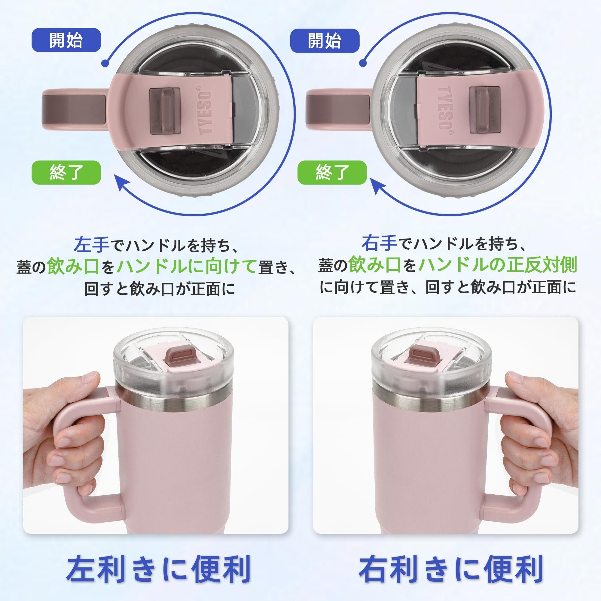 TYESO タンブラー 1.2L 水筒 保冷 ステンレスボトル ウォーターボトル ストロー 取っ手付き ジョッキ アウトドア 真空断熱 二重構造 広口 大容量 直飲 女の子 男の子 1200ml 桜色