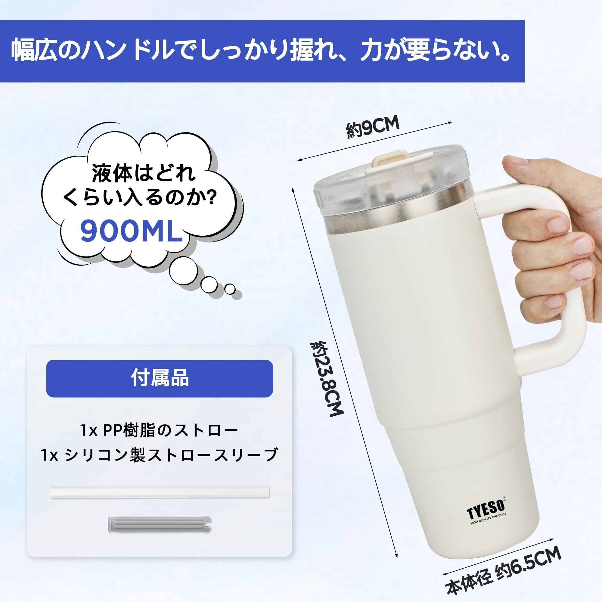 TYESO タンブラー 0.9L 水筒 保冷 ステンレスボトル ウォーターボトル ストロー 取っ手付き ジョッキ アウトドア 真空断熱 二重構造 広口 大容量 直飲 女の子 男の子 900ml ホワイト
