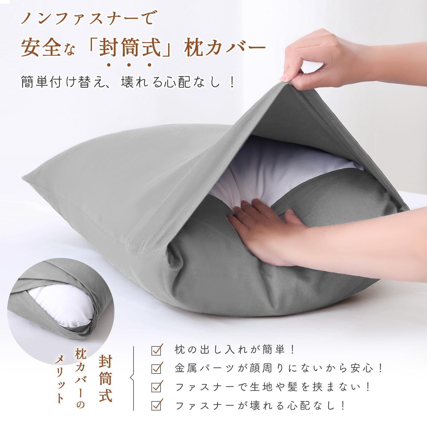 【ストレスフリーの封筒式デザイン&高耐久】ファスナーやボタンを使わない封筒式デザインを採用。寝返りを打っても肌に違和感なく快適に眠れます。さらに、枕をしっかり包み込む仕様なので、ズレにくく、取り替えもスムーズです。丈夫な縫製で毛玉やほつれができにくく、毎日使っても長持ちする高耐久仕様。