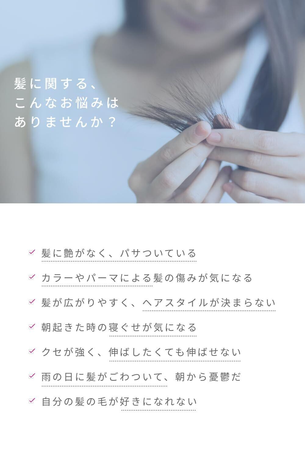 【商品の特徴】しっとり艶やか、手触りなめらかな髪へ導く髪の美容液。髪が太くまとまりにくい方・髪のツヤがなくパサつく方にオススメな洗い流さないヘアトリートメントです。