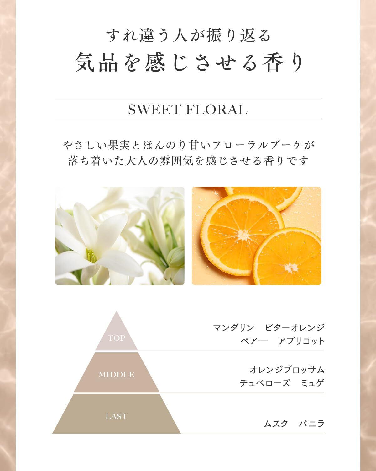 ✨【 気品を感じさせる香り ~SWEET FLORAL~ 】やさしい果実とほんのり甘いフローラルブーケが、落ち着いた大人の雰囲気を感じさせる香りです。□TOP:マンダリン・ビターオレンジ・ペア―・アプリコット □MIDDLE:オレンジブロッサム・チュベローズ・ミュゲ □LASE:ムスク・バニラ