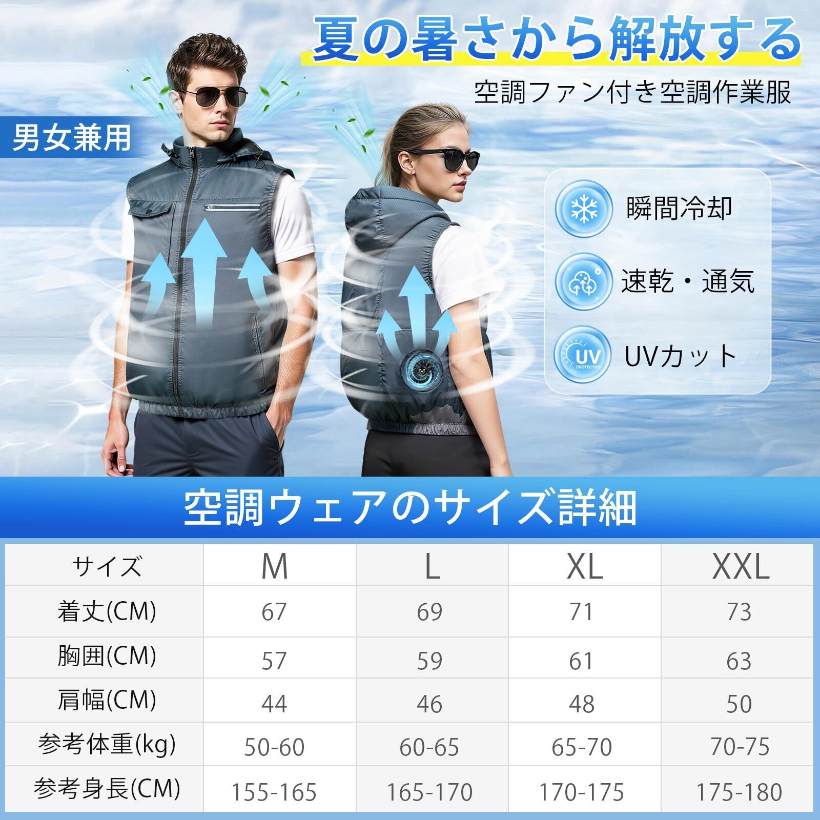 【3D循環送風・高品質ベスト・通気性抜群】まだ手に入れるベストの品質が悪い、仕上がりが粗い、縫い目が乱雑なことが心配ですか?こちらの高品質ファン付き空調ファンベストをぜひご覧ください。この作業服 ベストは100%ポリ工ステルとチタンコーティング裏地を採用し、縫い目がきちんとしていて、生地の微細孔があり通気性が良く、汗をかいてもすぐに乾きます。UVカット機能と撥水加工を兼ね備えた、90%の紫外線・赤外線をカットし雨にも強いです。直立ネックラインと取り外し可能帽子デザイン、背中から首元、頭にかけて心地よい風を通し、3D換気効果を高め、左右の腰の辺りに取り付けられたファンを用い、衣服の中に外気を取り入れ、体の表面に大量の風を流すことにより汗を蒸発させ、体を瞬時に冷やし、全身を清涼感で包みます。夏の猛暑を忘れてしまうほどの快適な涼しさを得られます。