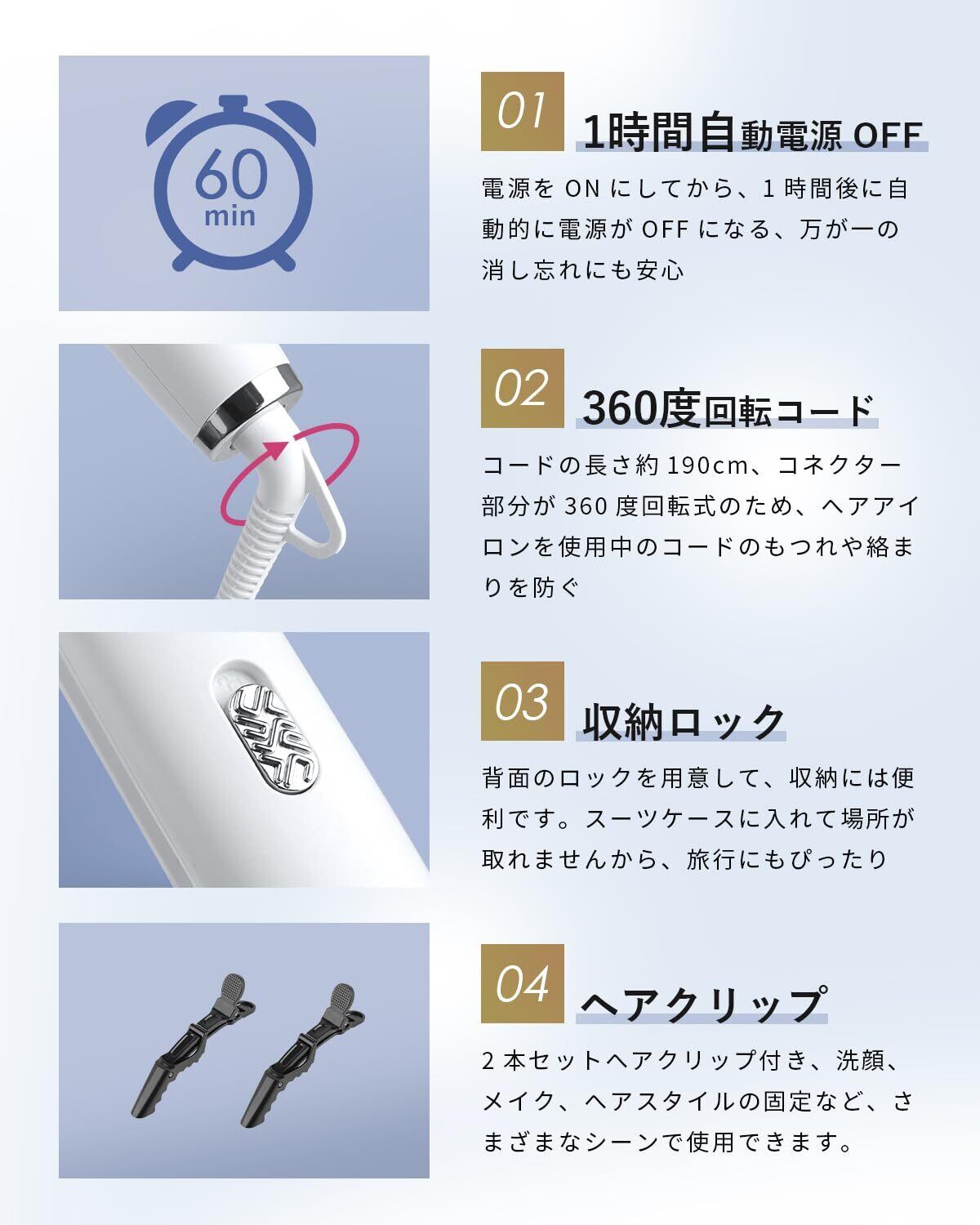 【海外対応&360度回転式&長めコード&パッケージ内容】100V~240Vまで対応しているので、海外でも使用できます。(※変換プラグはご用意ください。)360度回転式で使用中のコードのもつれや絡まりを防ぎます。さらに、約190cm長めの電源コード、場所を問わずにお使いいただけます。本体のサイズ:約3cm×33cm(プレート部分約120mm×24mm)、重量:約345g(電源コード含む)、消費電力:55W。パッケージ内容:Aliliyチタンヘアアイロン*1、ヘアクリップ*2、日本語取扱説明書*1。お買上げから、最大1年間の付き、万が一、初期不良や自然故障など不具合が応じた場合、(「アカウントサービス」>「」>「販売元」>「質問する」は領収書に替わります。)遠慮なくご連絡してください。