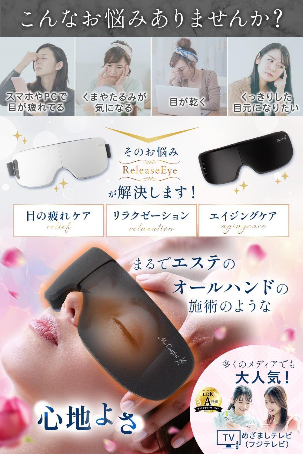 【目の美容院監修のWケアモデル】「広範囲のあたため」と「部位毎の空気圧」を実現したMyComfort(マイコンフォート)のリリースアイ。[あたため機能] ヒーティングエリアを広範囲に設けることで、首元・目元をしっかり温めることが可能に。また、耐久性と保温性に優れた”グラフェン加熱方式”を採用し、温かさを身体に浸透させます。低温・高温の2つの温熱パターンを用意しているので、お好みに合わせて選択が可能です。 [空気圧機能] 目元とこめかみ部分で独立したエアバッグが最適な圧力で心ゆくまで空気圧ケアを行います。あたため機能と合わせて使用することも単独で空気圧ケアを行うことも可能で、最大6パターンの使用方法でお楽しみいただけます。【こんな方にオススメ】目元周りが気になる…。スマホやPC作業を長時間している…。自宅で手軽に目元周りのケアしたい…。プロレベルの目元ケアを試してみたい…。目の美容院が監修したリリースアイで今すぐ極上の目元ケアをお楽しみください。