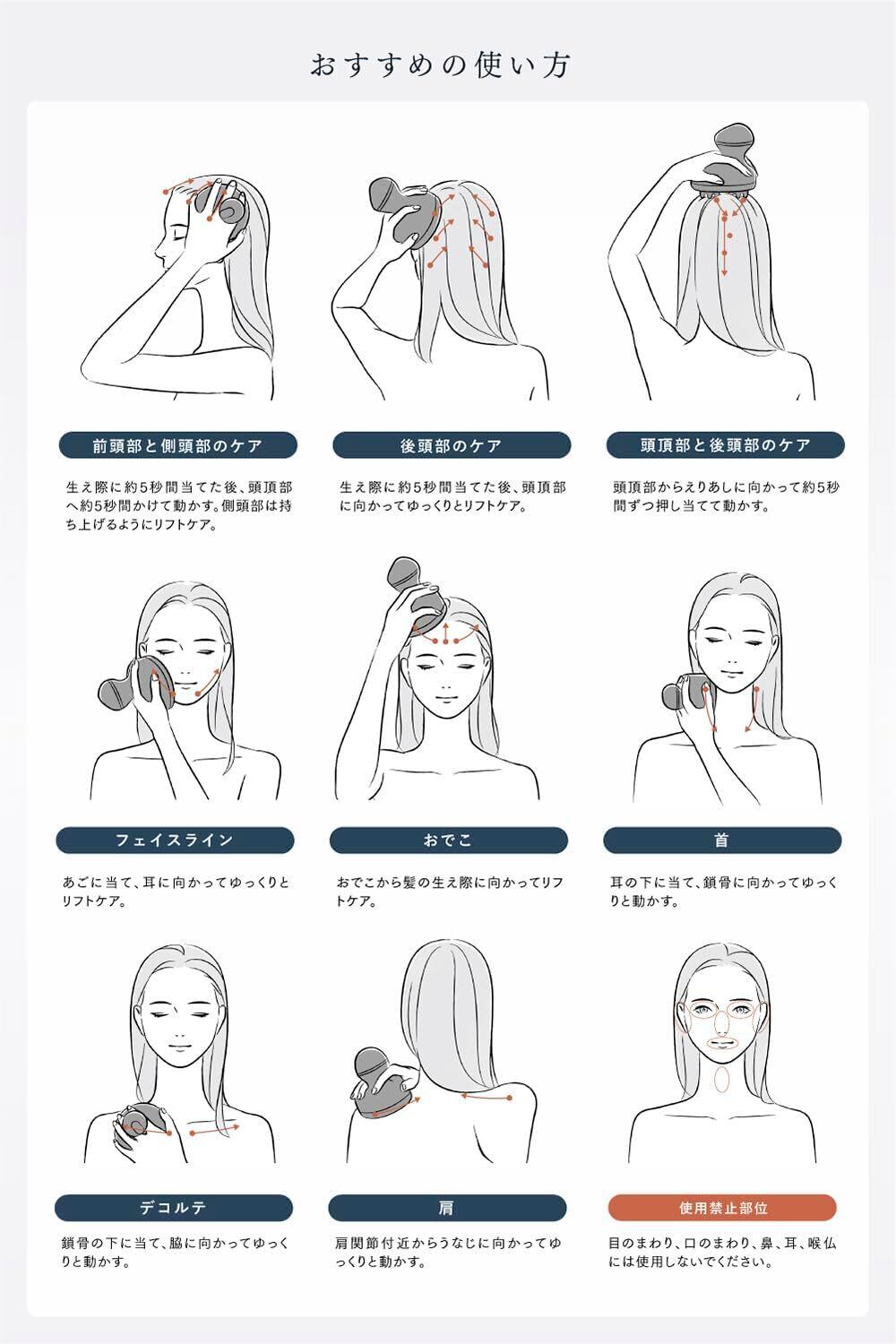 【部位別アタッチメント】頭皮専用ニードルタイプ:肌への接地面を小さくすることで「点」で頭皮を刺激。頭皮・ボディ用:ハンド感覚で心地よくつまみ上げながら、普段のシャンプーでは落としにくい頭皮の汚れを掻き出します。フェイス用:突起の数・角度にこだわった設計で、肌に密着する面積を広く確保し、EMSの通電性を高めます。