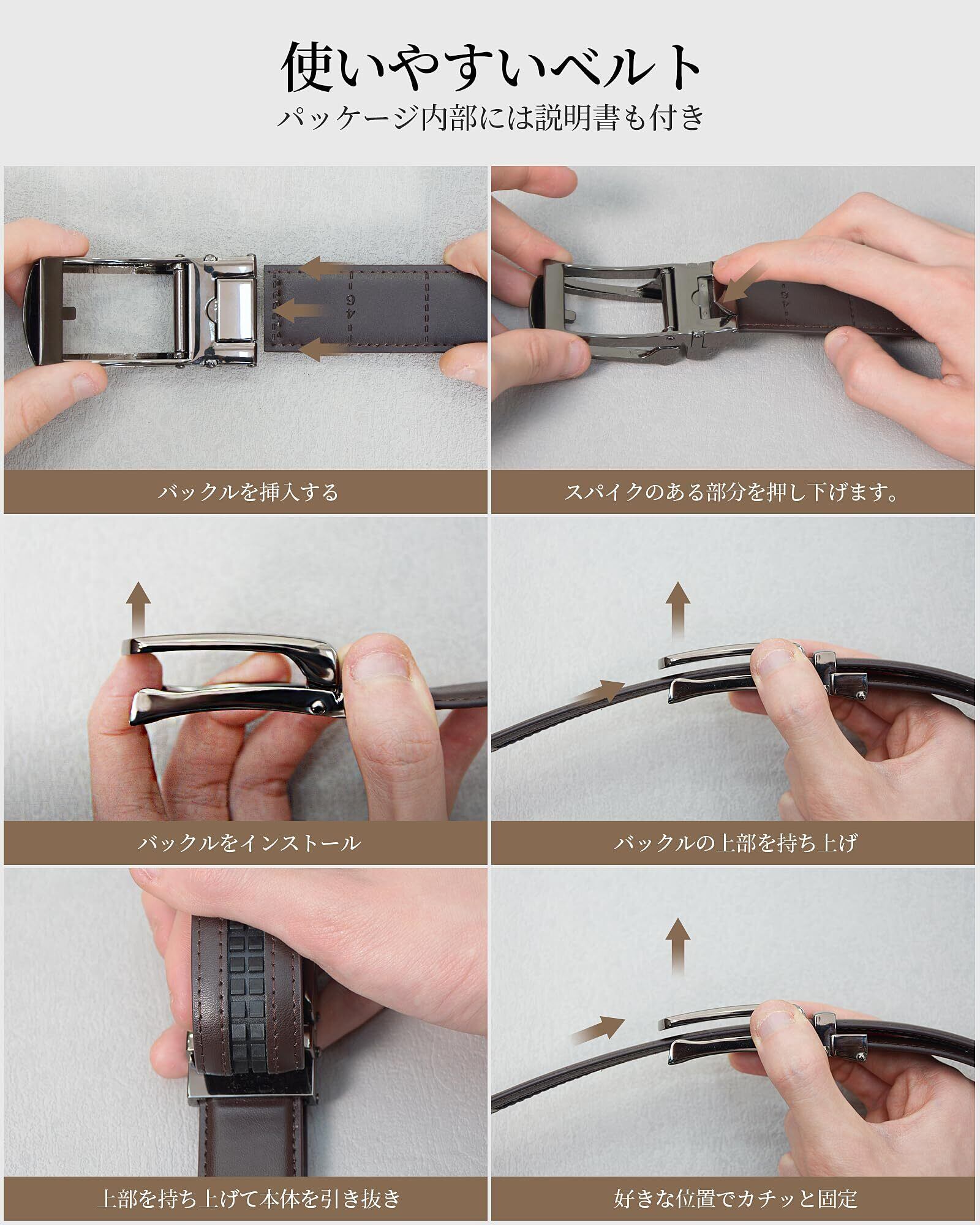 【オートロック式】穴がない設計で、オートロック式のバックルはスマートな装着・脱着が簡単に出来ます。ベルトの脱着方法:1.バックルの上部を持ち上げ。2.剣先を差し込む。3.好みの位置までカチカチとベルトをスライドさせます。4.外すや緩めたいときはバックルの上部を持ち上げて、ベルトを簡単に調節できます。