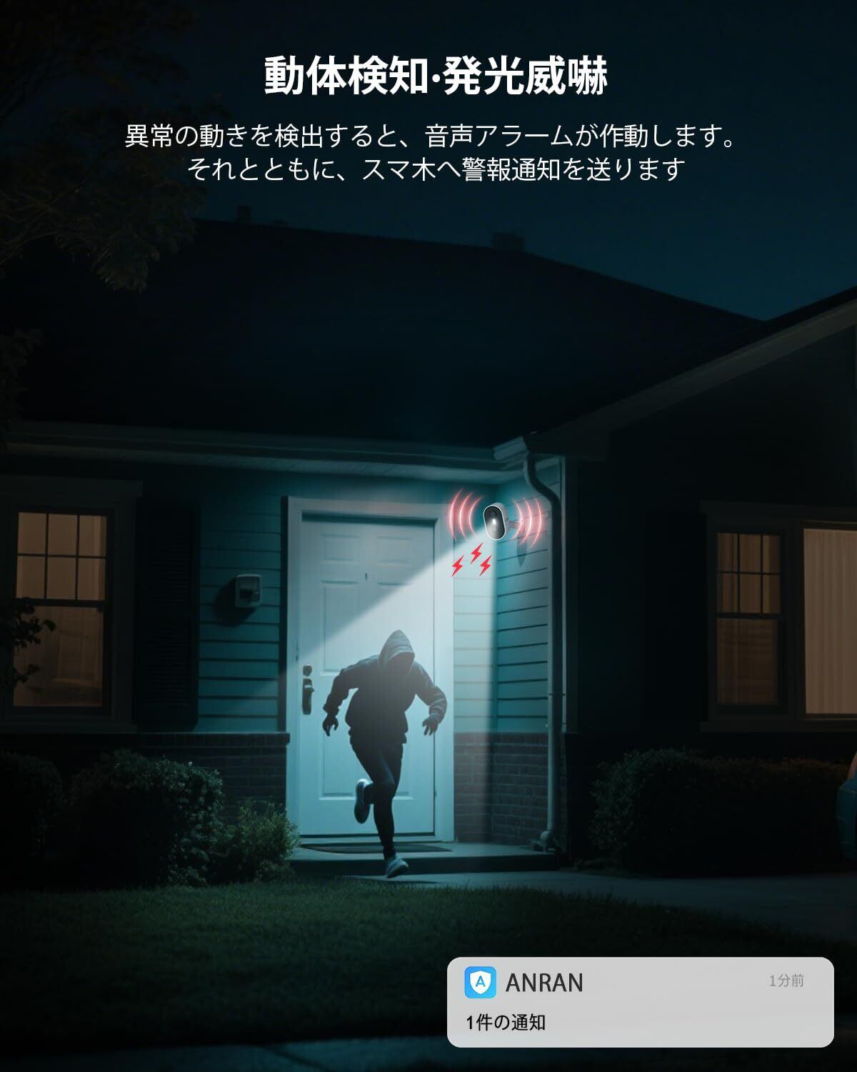 【500万画素の高画質・鮮明なカラー夜間撮影・夜間防犯対策】Anran監視カメラは最新型発光センサーとサイレンスピーカーを搭載し、強力な光照射で不審者を抑止し、家庭の安全を守ります。防犯カメラ 屋外 ソーラー 500万画素 のカメラは、高画質な5MPの映像を提供し、夜間でも鮮明なカラーで記録が可能です。アプリから「サイレン」機能をタップすれば、遠隔操作でカメラから「ブッブッブッ」と音声警告が鳴り、泥棒対策に効果的です。また、センサーライトが点灯すると、画面がカラーに切り替わり、夜間でも顔が鮮明に記録され、犯罪証拠をしっかり保存します。さらに、スマートフォンでサイレンと光警報モードの設定を自由に調整でき、周囲の環境に合わせた最適なセキュリティを提供します。