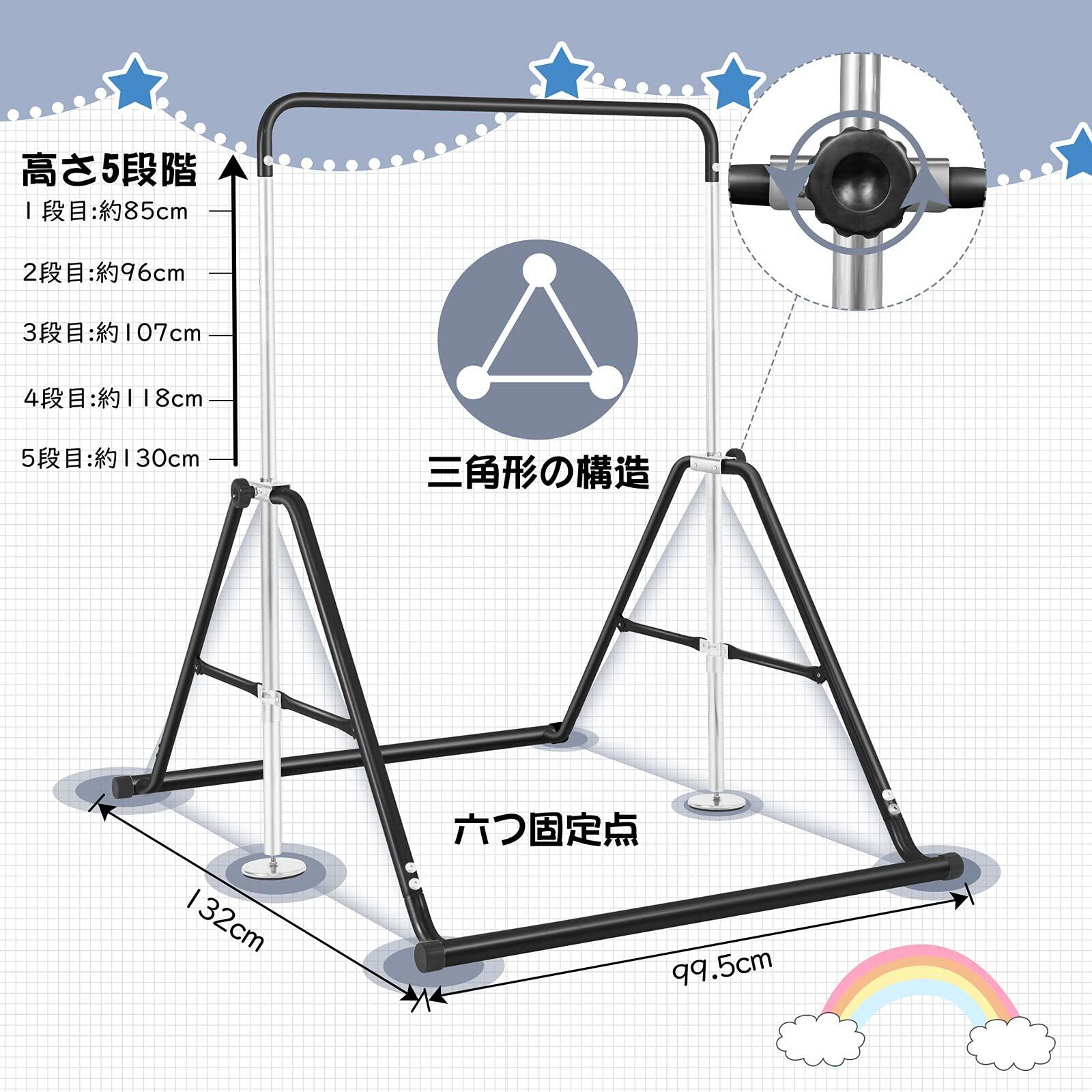 ✨ 【高さ5段階調節可能】高さの順次には85cm/96cm/107cm/118cm/130cmまで高さ調整できます。三角形の構造は頑丈で、子供の成長に合わせて、長く使えます。いつでも楽しく鉄棒でぶら下がり!