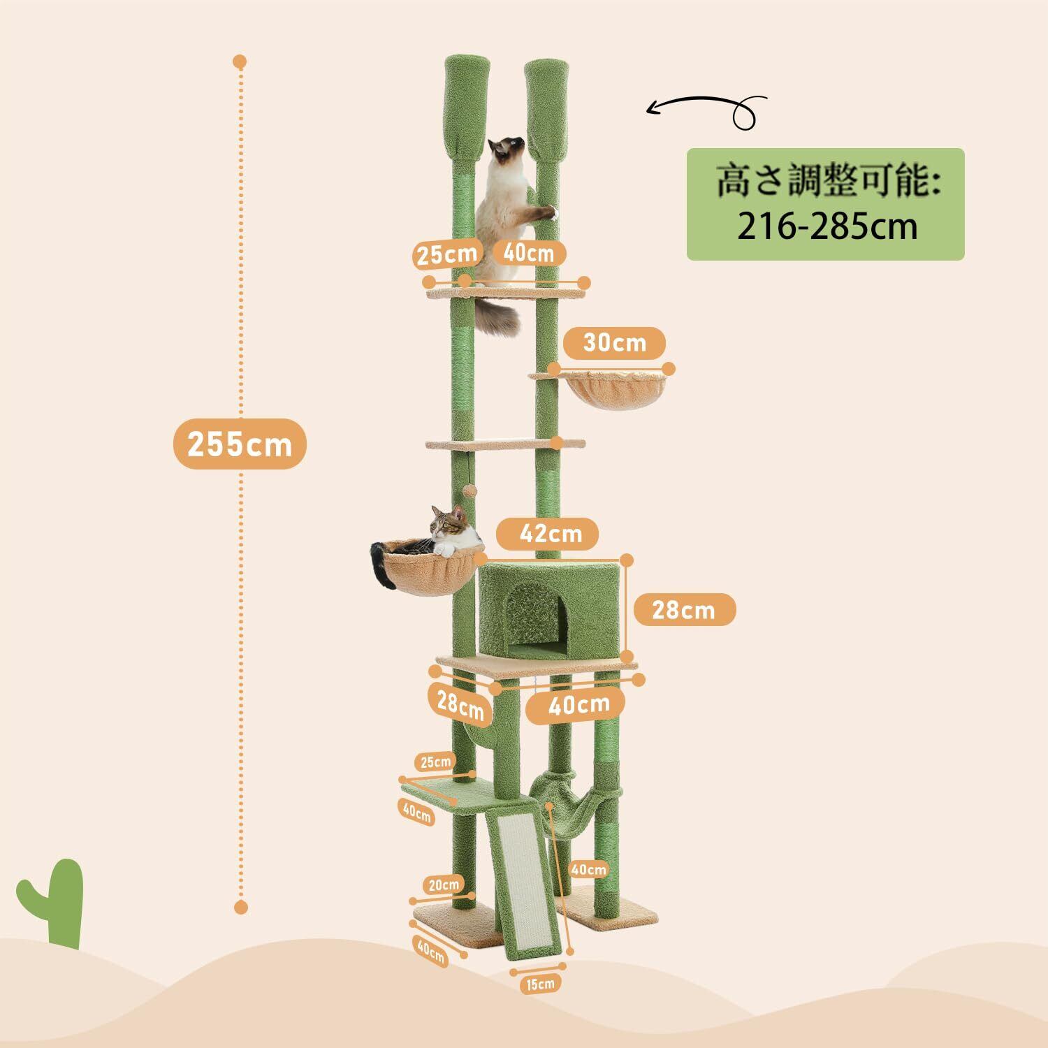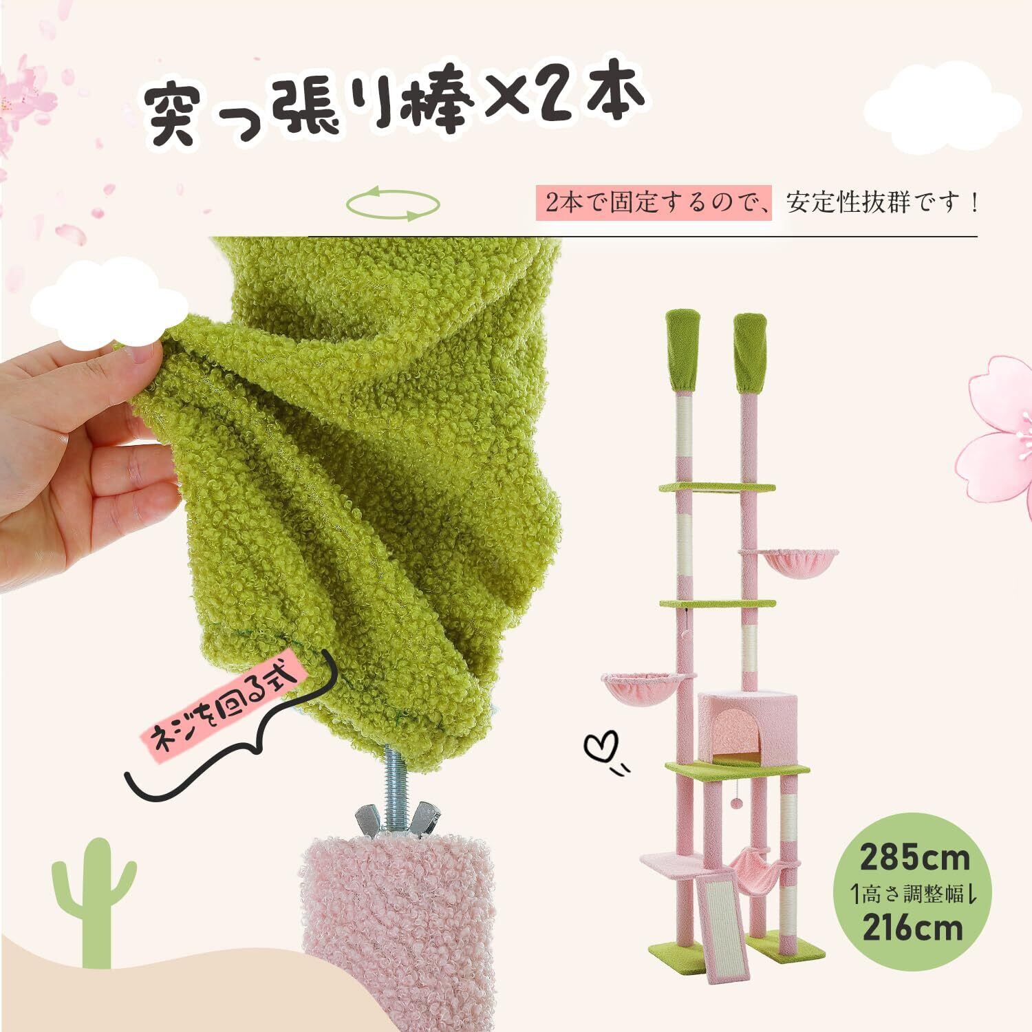 PETEPELA(ぺテぺラ) キャットタワー 突っ張り スリム 多頭飼い お花 つっぱり ハンモック 爪研ぎ つめとぎ 省スペース 運動不足解消 おもちゃ カラフル かわいい - ピンク 高さ調整幅216~285cm
