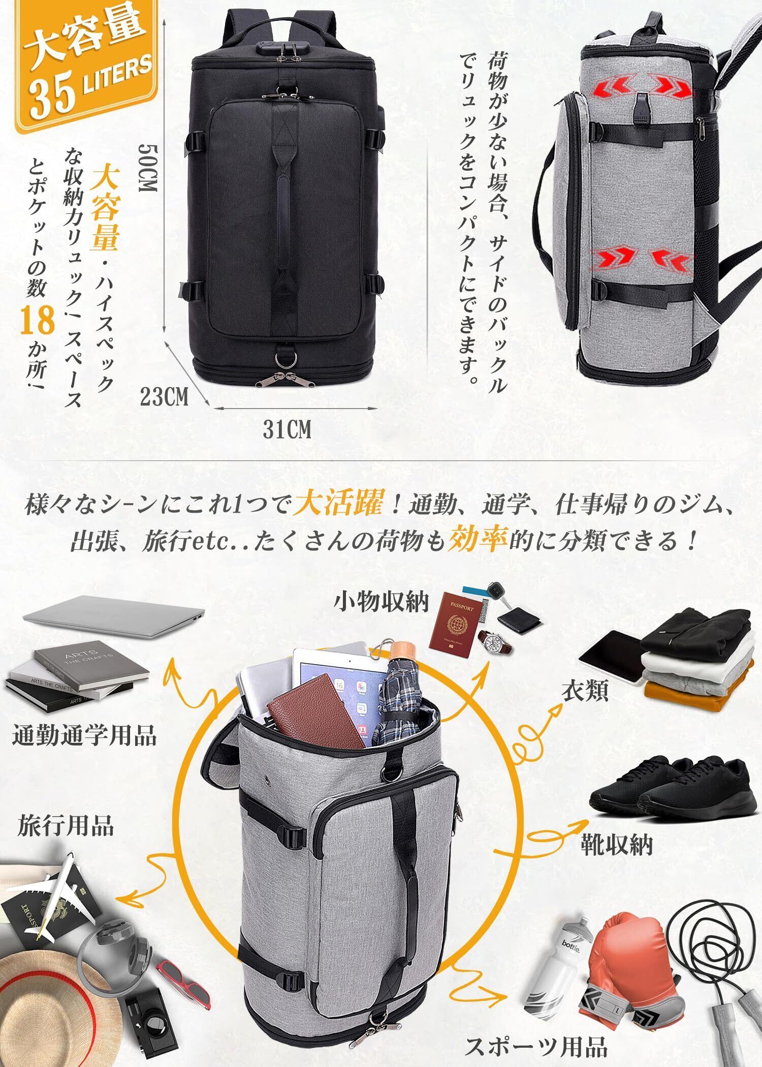 [VENDAGO] リュック 大容量 35L ビジネスリュック ボストンバッグ ジム 機内持ち込み 4way リュックサック バックパック パスワードロック 荷物用ベルト USB充電ポート スポーツバッグ おしゃれ 軽量 靴/弁当収納