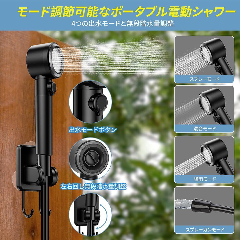 【商品仕様】サイズ:ポンプ:9.2cm×11cm×高さ4cm、ホース:2m◎重量:317g ◎材質:ABS ◎電圧:DC 3.7V、入力電圧:5V/2A ◎連続動作時間:強さモード:80分間;節能モード:180分間 ◎水流量: 3L/mー6L/m付属品:ポンプ、ホース、シャワーヘッド、USB充電ケーブル、吸盤、収納袋、日本語説明書◎商品保障:一年間メーカー。