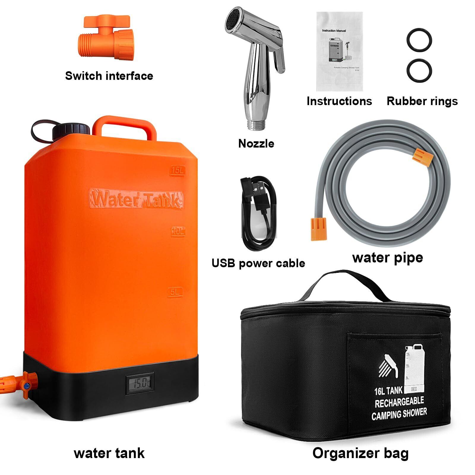 AZXJC 4.5ガロンシリカゲルタンク、ポータブルキャンプシャワー、USBバッテリー充電、太陽熱加熱、シャワーヘッド付き、電動ポータブルアウトドアシャワー、内蔵温度計、ビーチ、キャンプ、ハイキング | Lulu