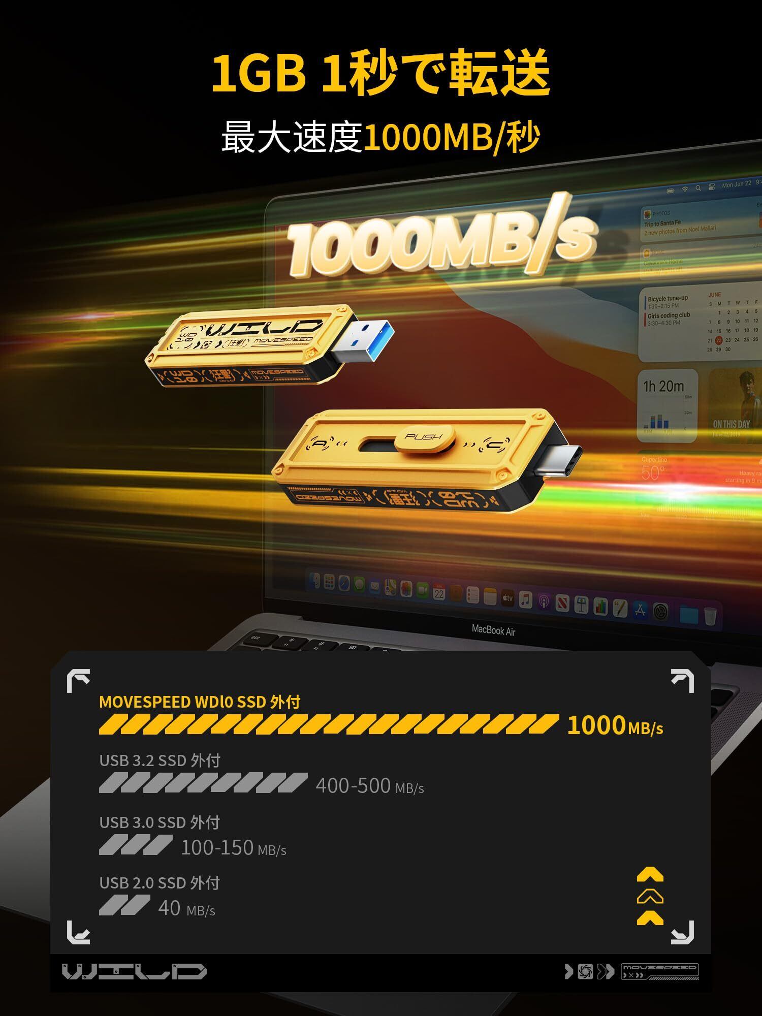 【軽量小型・優れた放熱性・耐衝撃】コンパクトでケーブルレス、持ち運びに便利なデザイン。ssd usbはパソコンに直接挿すだけで簡単にお使いいただけます。合金筐体製筐体は高級感と優れた放熱性を兼ね備えています。※熱伝導に優れた金属製筐体は表面温度がプラスチック製より高いことがありますが、これは正常な動作です。